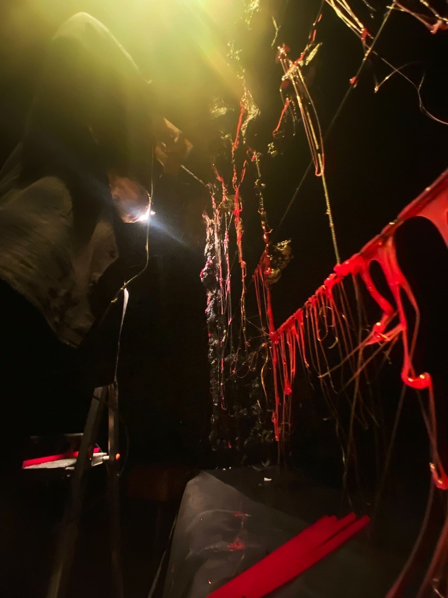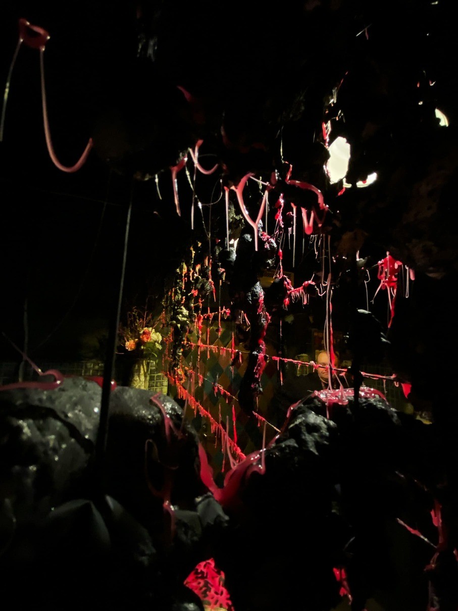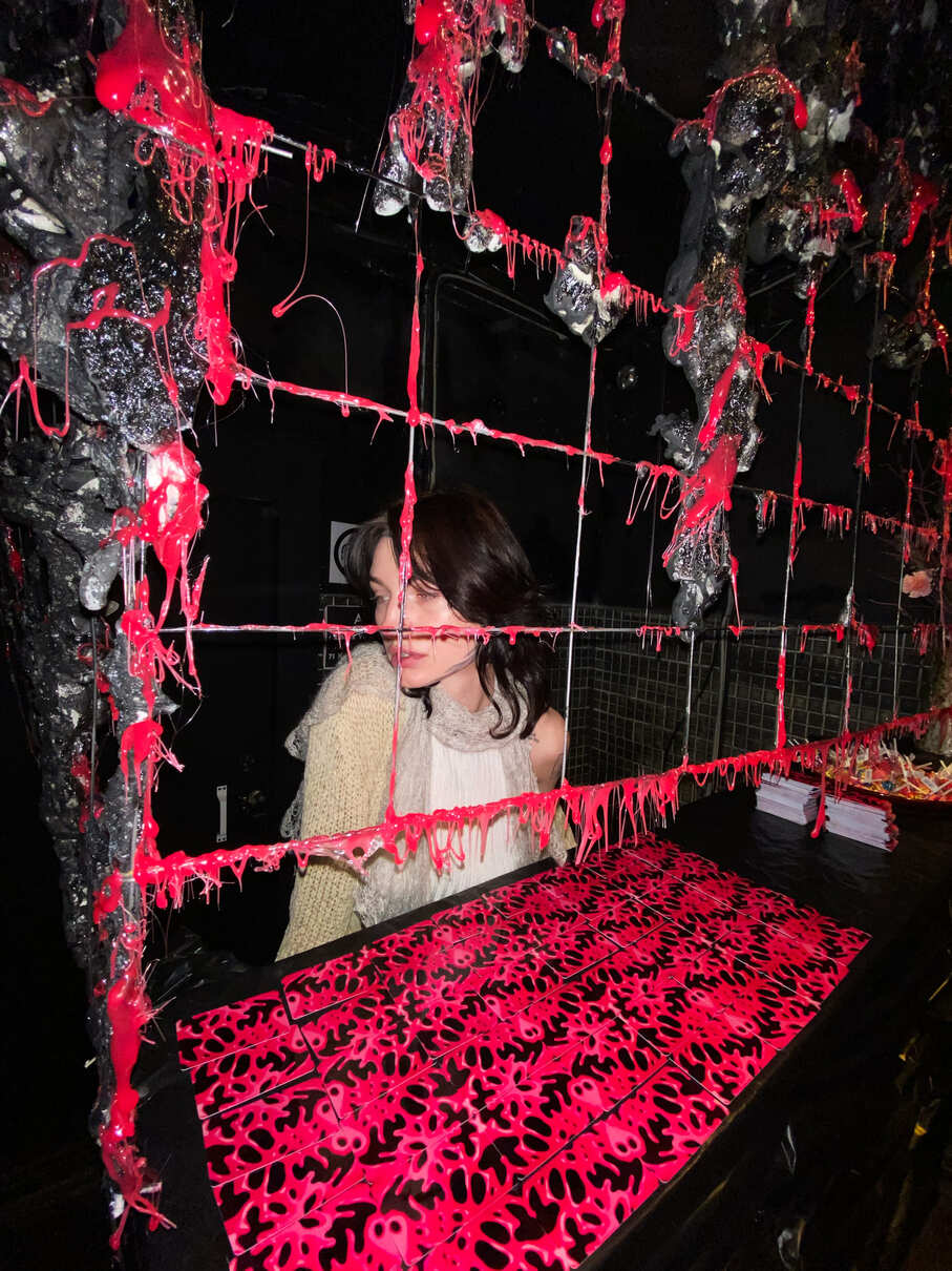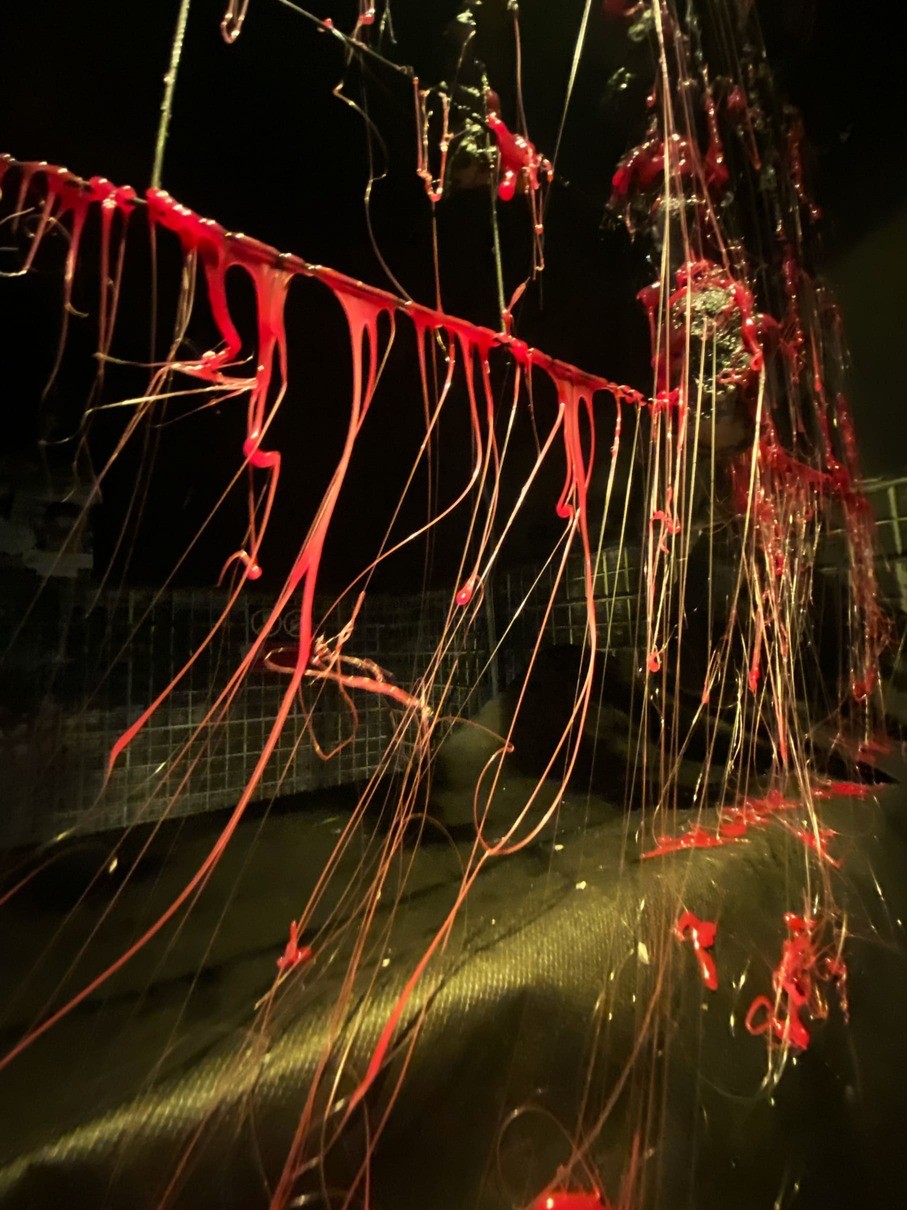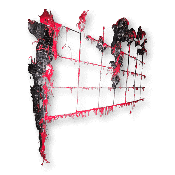 ФЕЙС-КОНТРОЛЬ – МЕТАЛЕВА СІТКА, МОНТАЖНА ПІНА, АЕРОЗОЛЬНА ЧОРНА ФАРБА, РОЖЕВІ КЛЕЙОВІ СТЕРЖНІ, ЧОРНА ПЛІВКА, КВІТКОВА КОМПОЗИЦІЯ.
