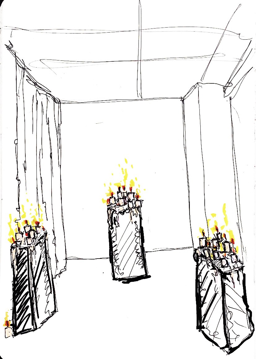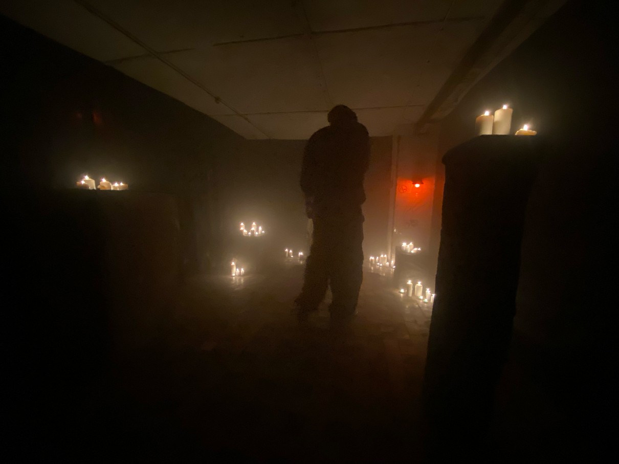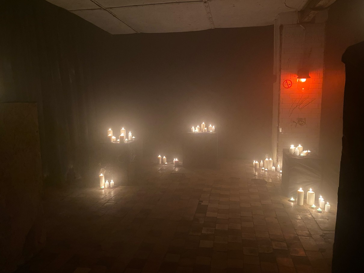ПЕРФОРМАНС СТЕЙДЖ – ЧОРНІ КУБИ, ЧОРНИЙ АГРОТЕКСТИЛЬ, СВІЧКИ.