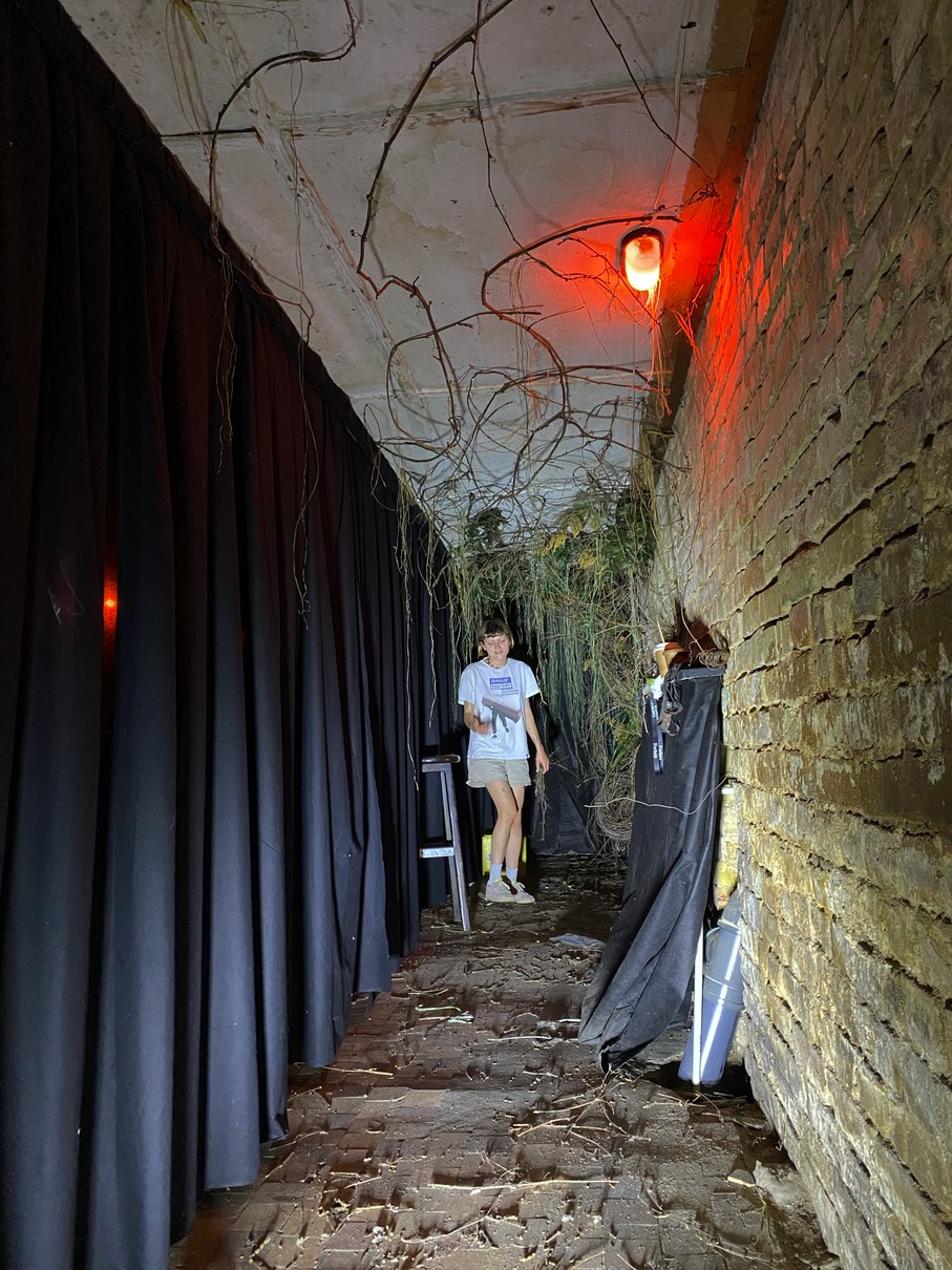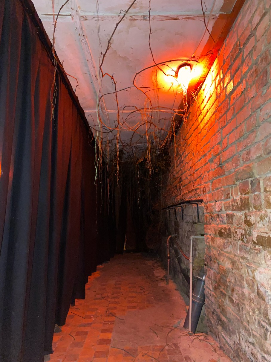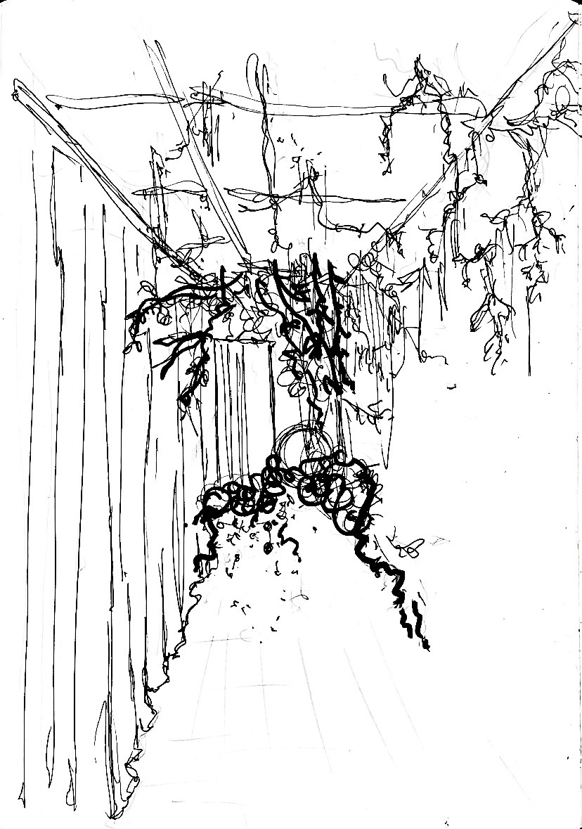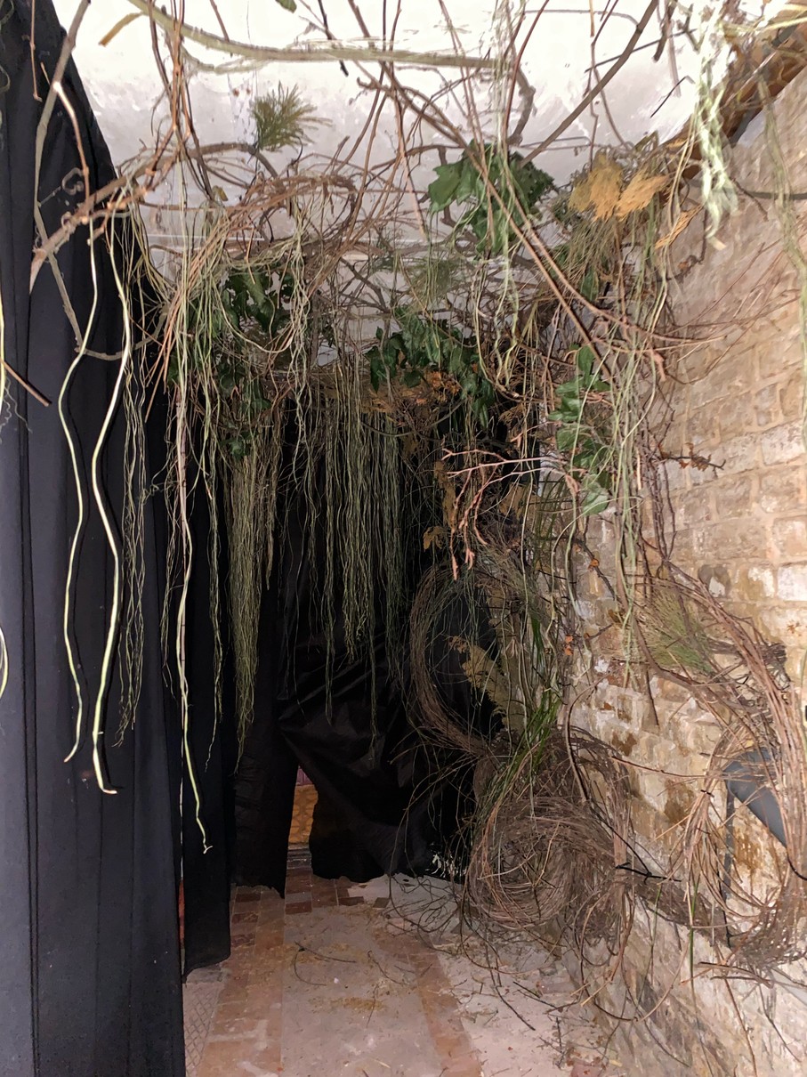 ТУНЕЛЬ – СУХІ ГІЛКИ ДЕРЕВ, СТАБІЛІЗОВАНІ ГІЛКИ З ЛИСТЯМ, СНОПИК РОГОЗУ, ГІЛКИ ВИНОГРАДНОЇ ЛОЗИ, КОРІННЯ, СУБСТРАТ ДЛЯ РОСЛИН, СКОБИ, СТЯЖКИ, ЧОРНА ТКАНИНА.