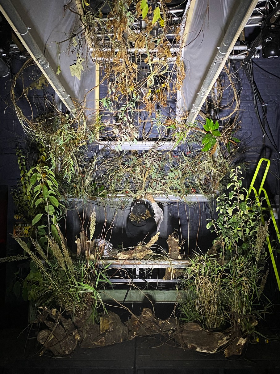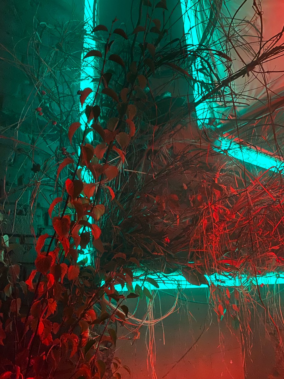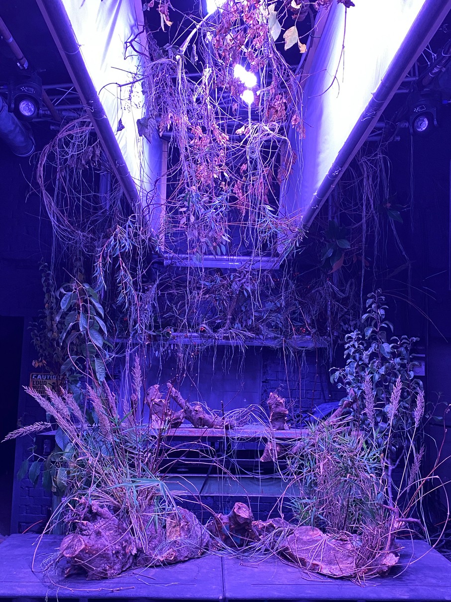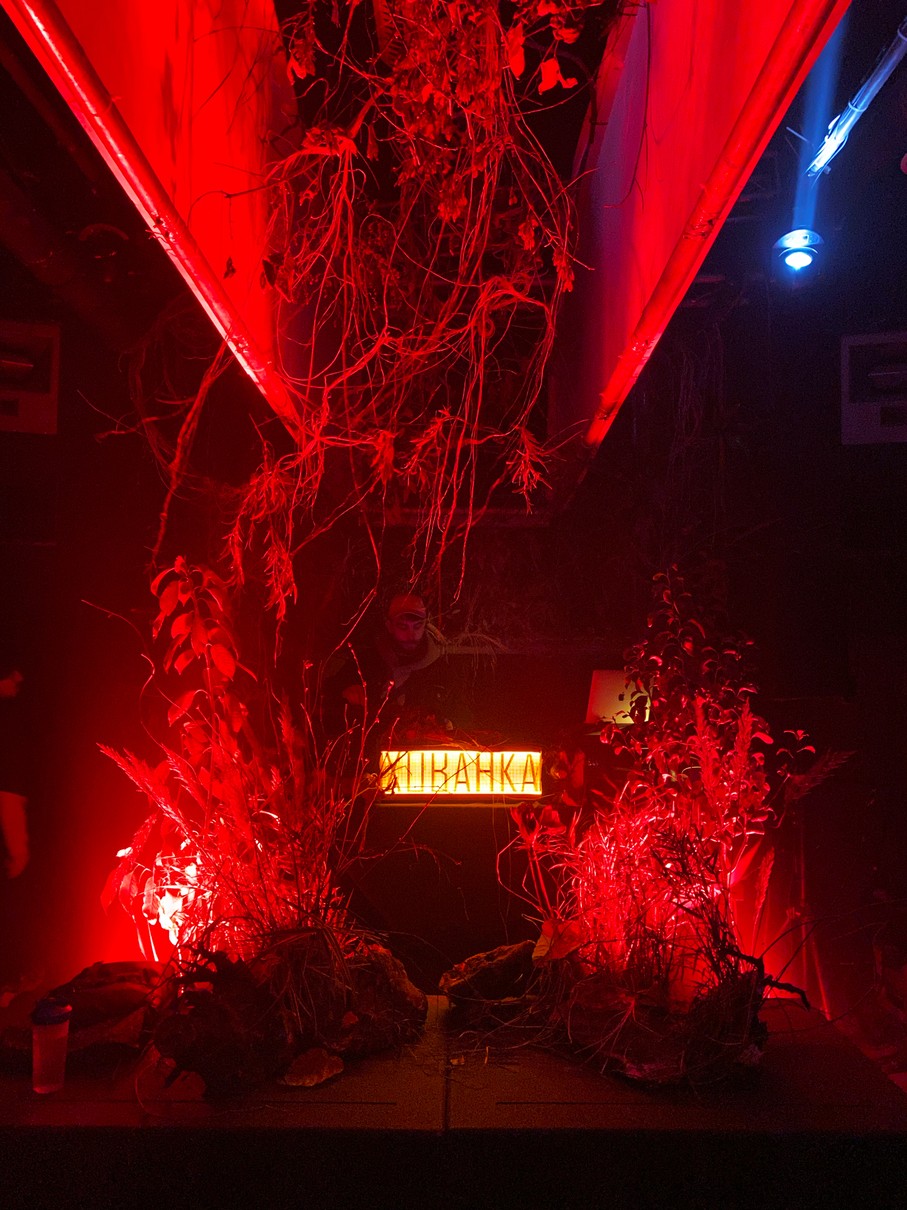 ЛАБІРИНТ НА СТЕЛІ – ОСВІТЛЮВАЛЬНЕ ОБЛАДНАННЯ, ЧОРНА ТКАНИНА, КАБЕЛЬНІ СТЯЖКИ.