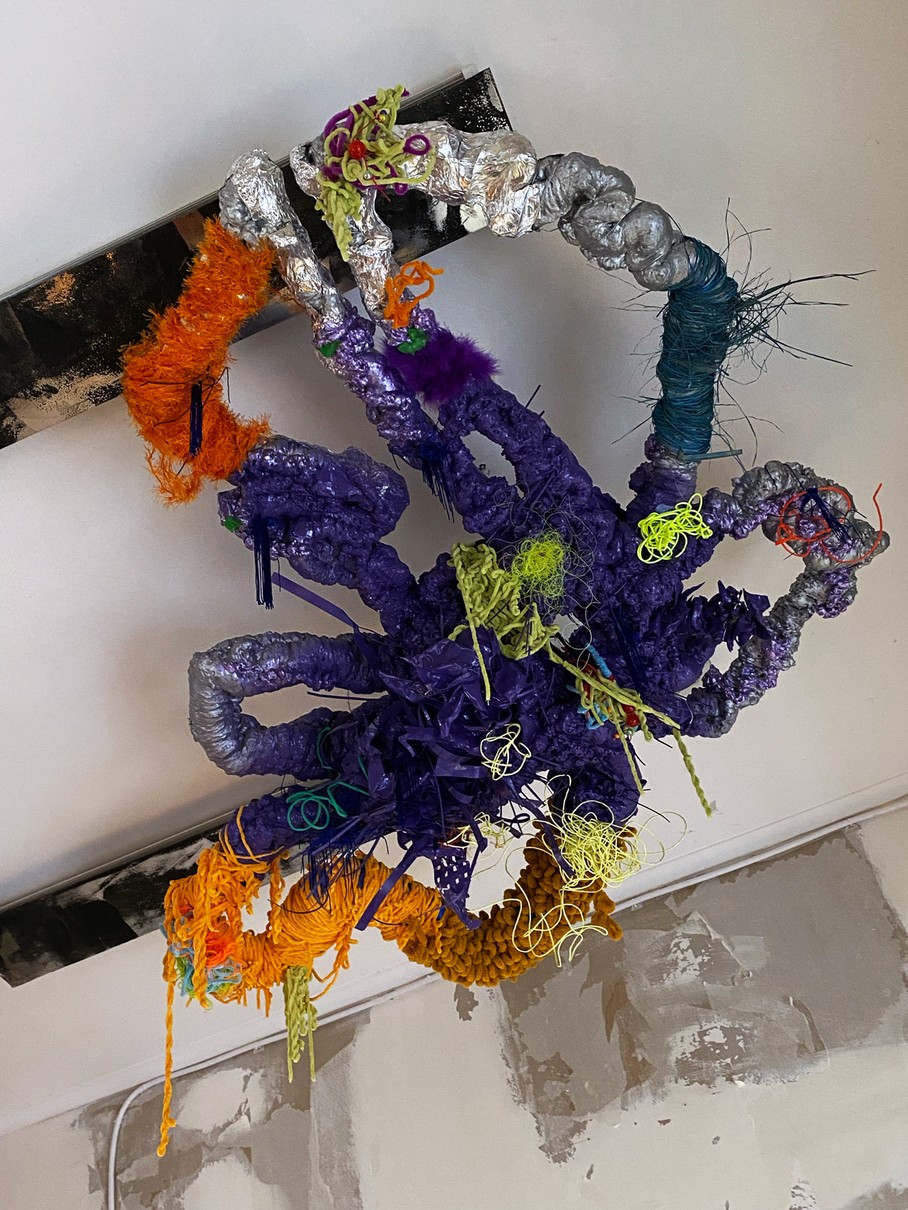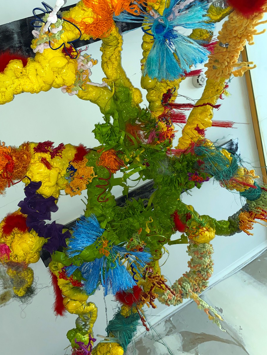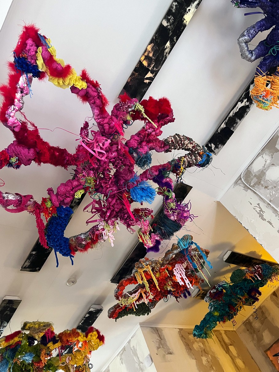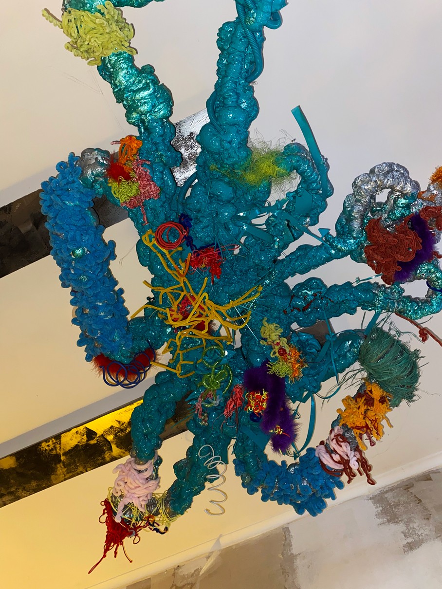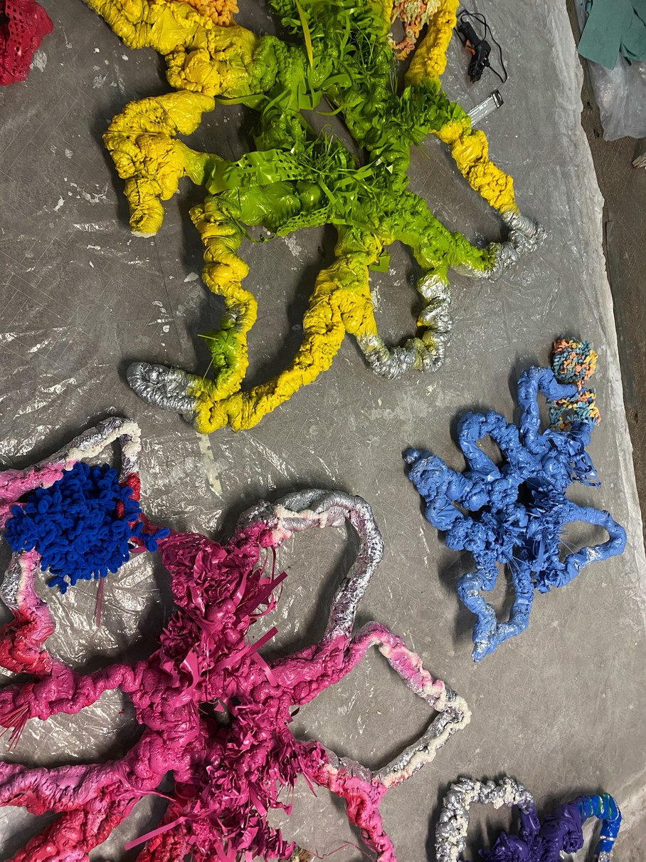 MOUNTING FOAM, AEROSOL PAINT, COLORANTS, GLUE, VARNISH, METAL WIRE, TIES, RECYCLED MOLTEN PLASTIC, PLASTIC BOTTLES, DOWNY THREAD, BEADS, CHENILLE WIRE, COLORED RECYCLED FISHING LINE, THREAD, HEAT SHRINK, SILICONE COLORED RODS, PAINTED CATTAIL SHEAF, COLORED WIRE, WHITEWASH BRUSHES, RUBBER BANDS, ROPES, FRINGE, FOIL TAPE, CORRUGATED PIPE, TAPE.