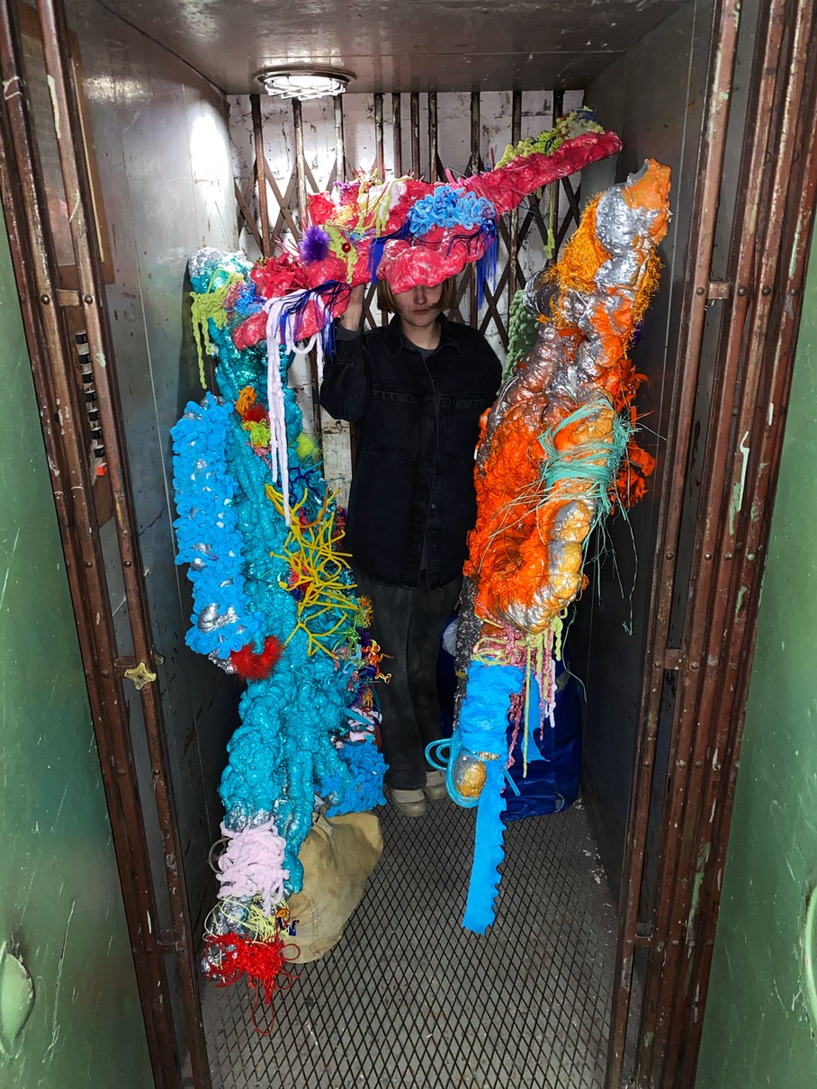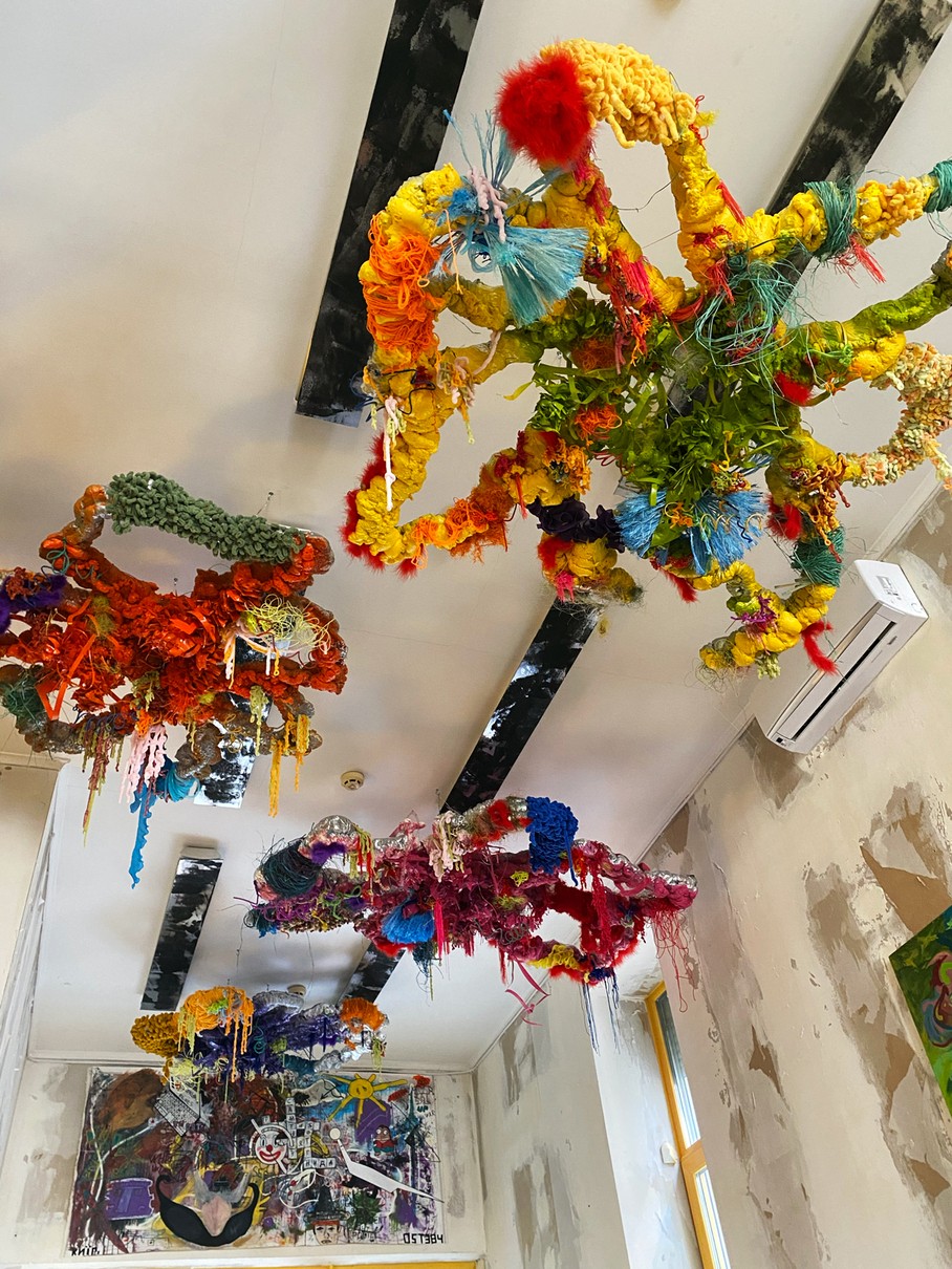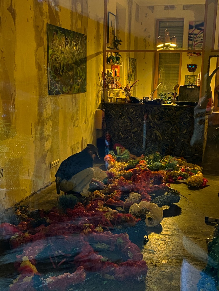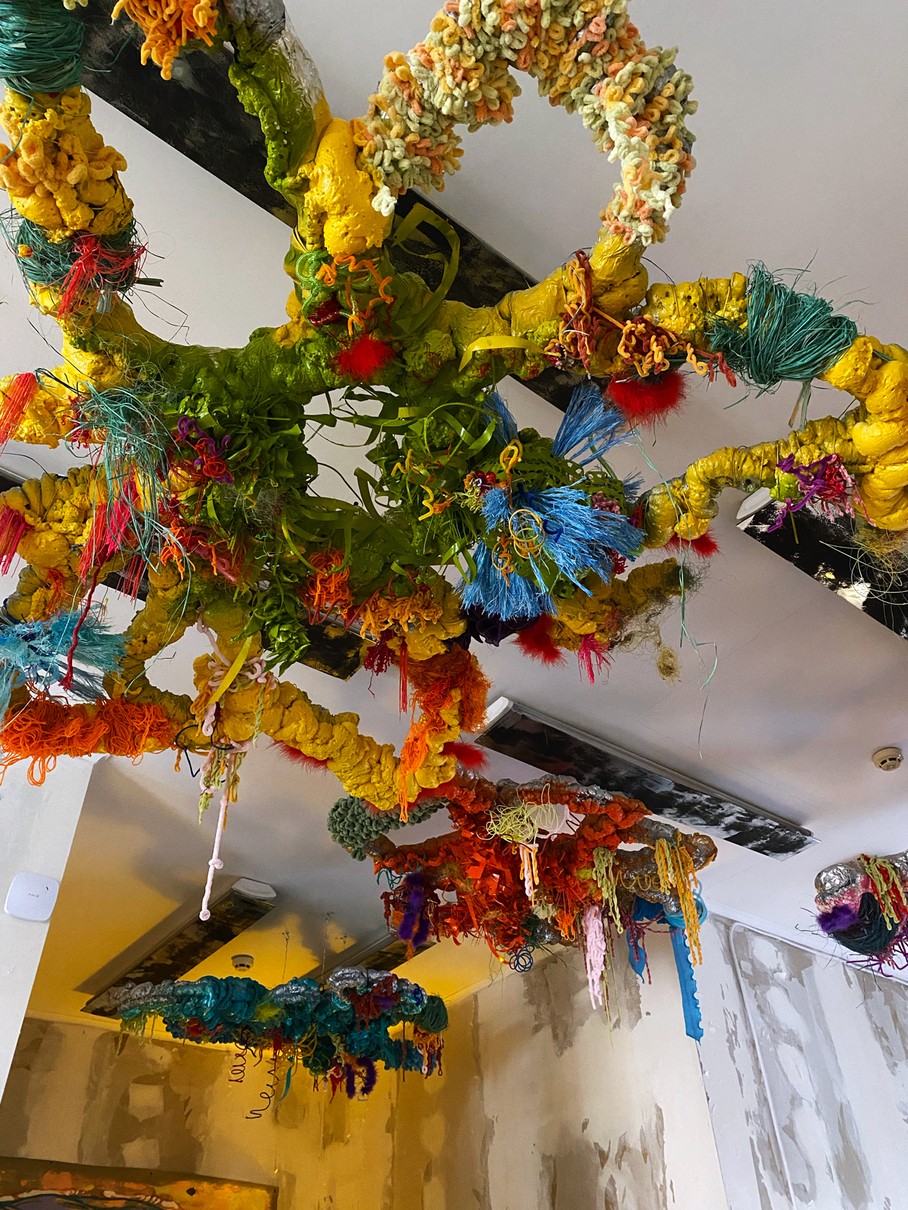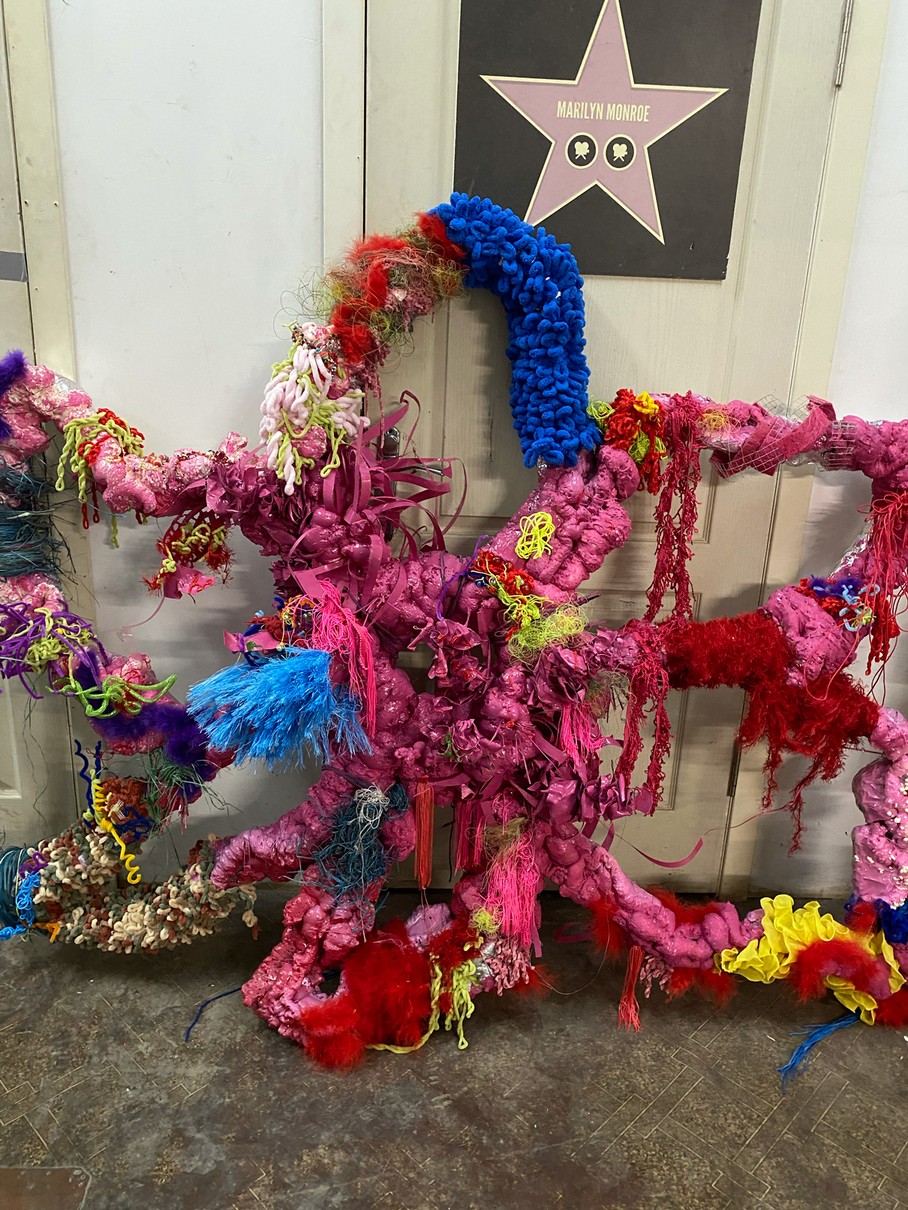 MOUNTING FOAM, AEROSOL PAINT, COLORANTS, GLUE, VARNISH, METAL WIRE, TIES, RECYCLED MOLTEN PLASTIC, PLASTIC BOTTLES, DOWNY THREAD, BEADS, CHENILLE WIRE, COLORED RECYCLED FISHING LINE, THREAD, HEAT SHRINK, SILICONE COLORED RODS, PAINTED CATTAIL SHEAF, COLORED WIRE, WHITEWASH BRUSHES, RUBBER BANDS, ROPES, FRINGE, FOIL TAPE, CORRUGATED PIPE, TAPE.