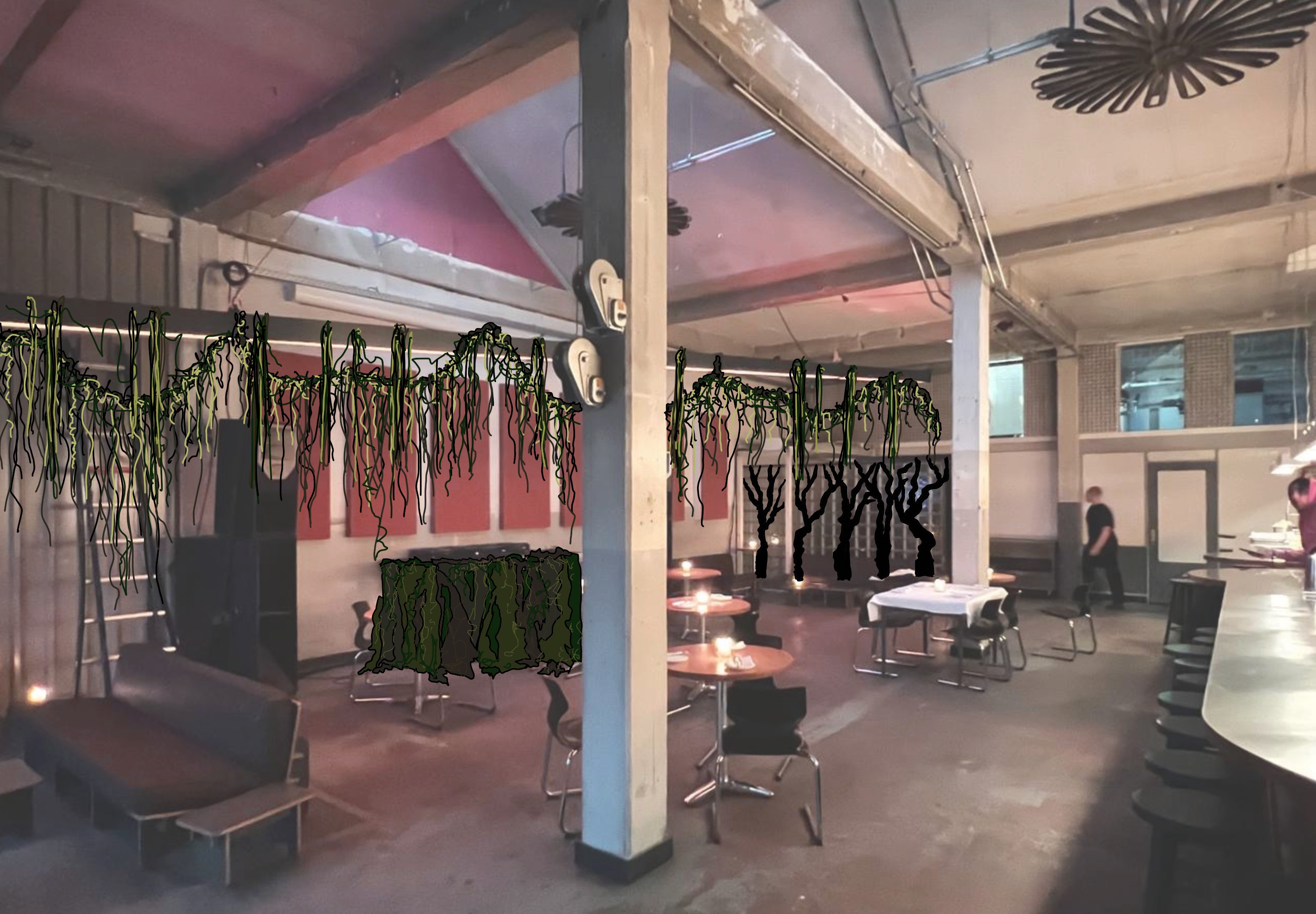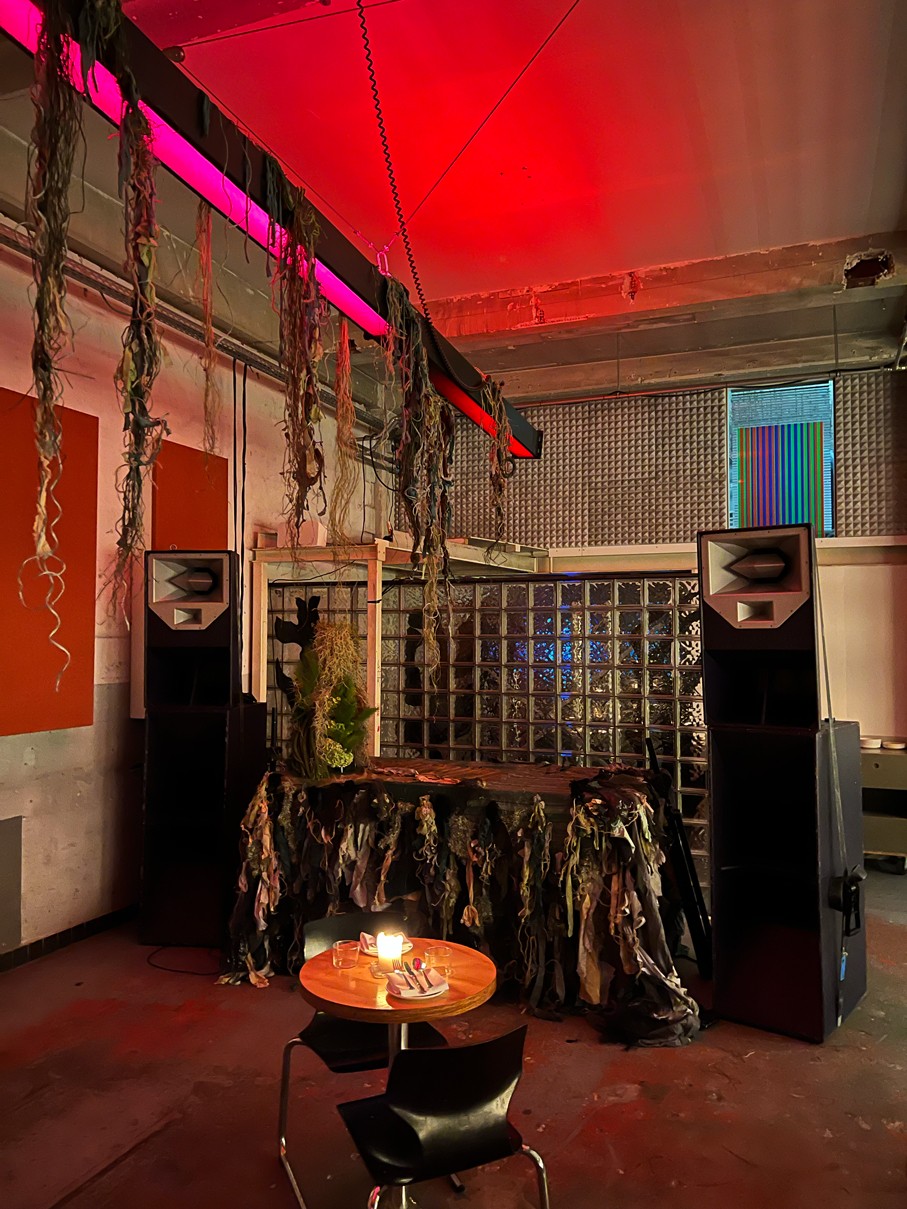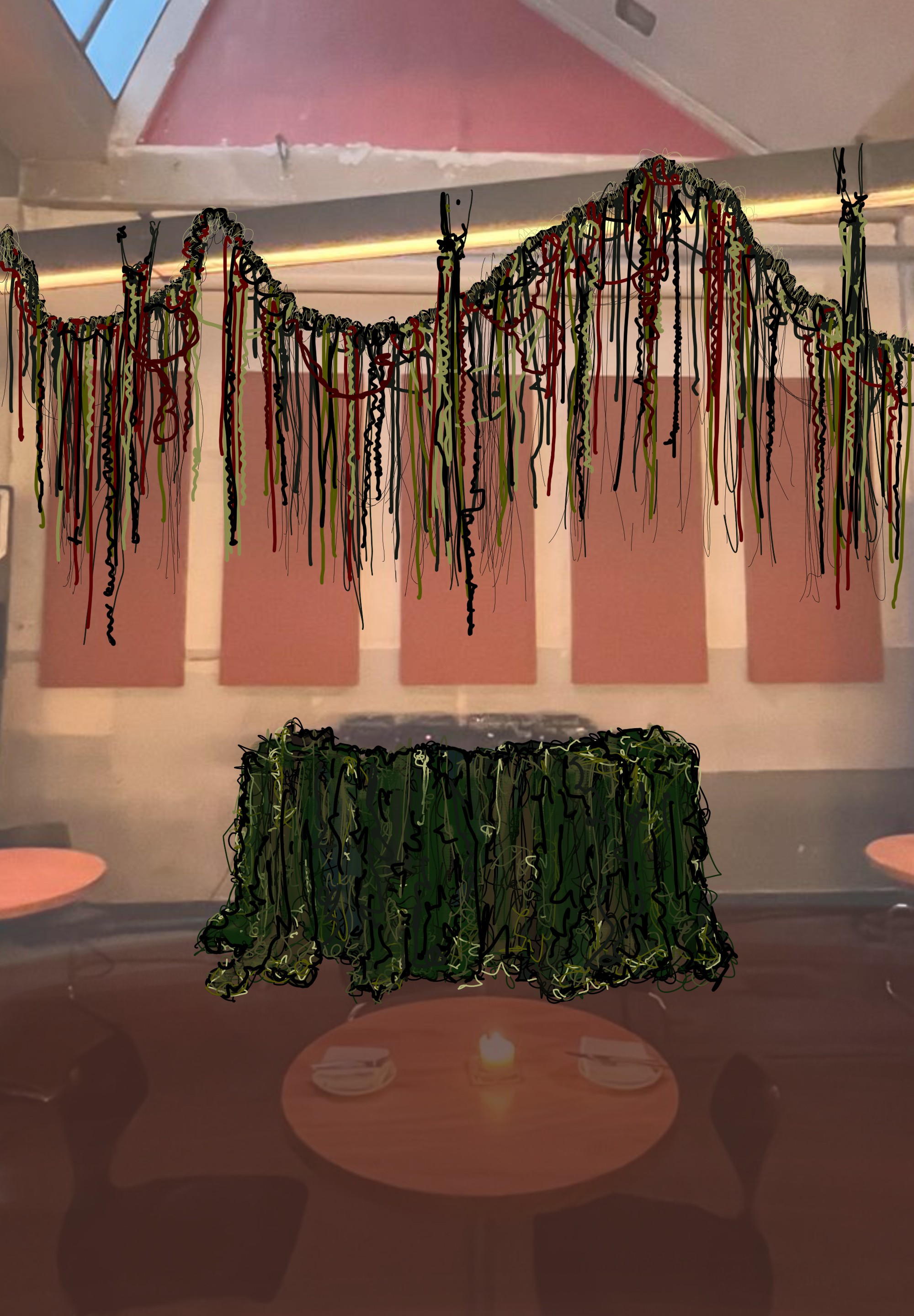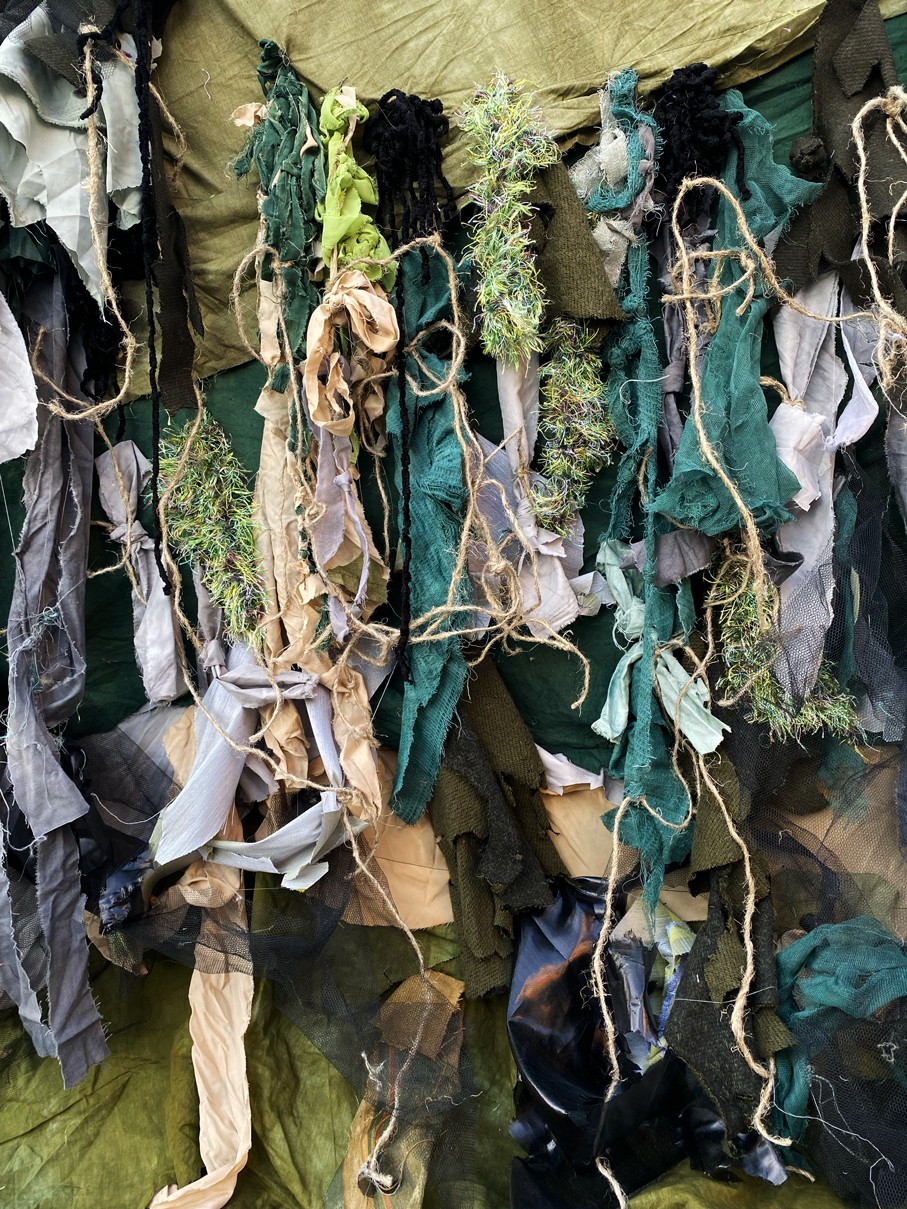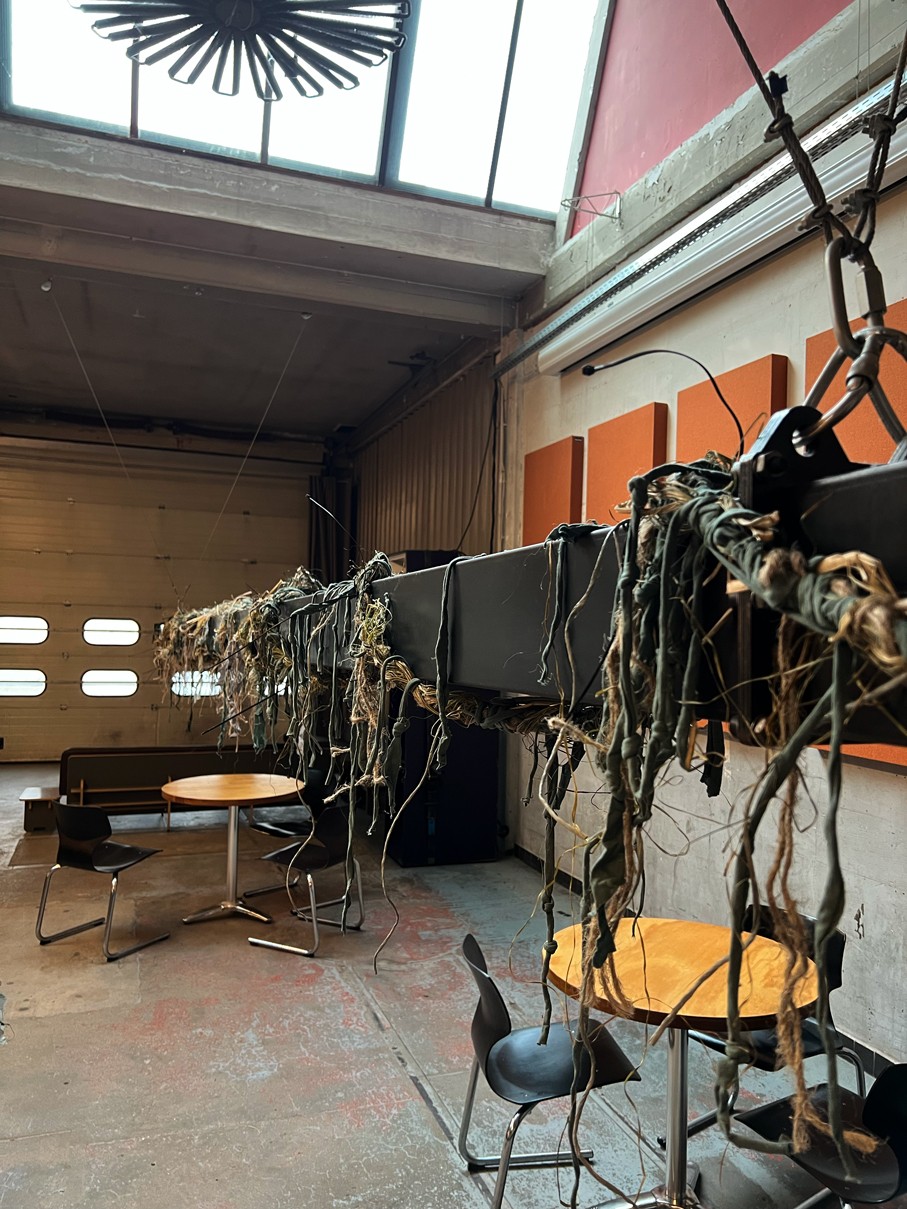 DANCE FLOOR AREA “VINES HANGERS“ TYPHA, JUTE THREAD, FABRIC TAPES, ROPES, RUBBER THREAD, COLORING AGENTS, CABLE TIES.