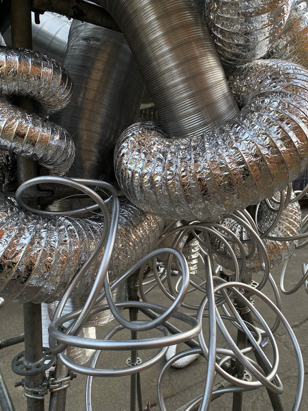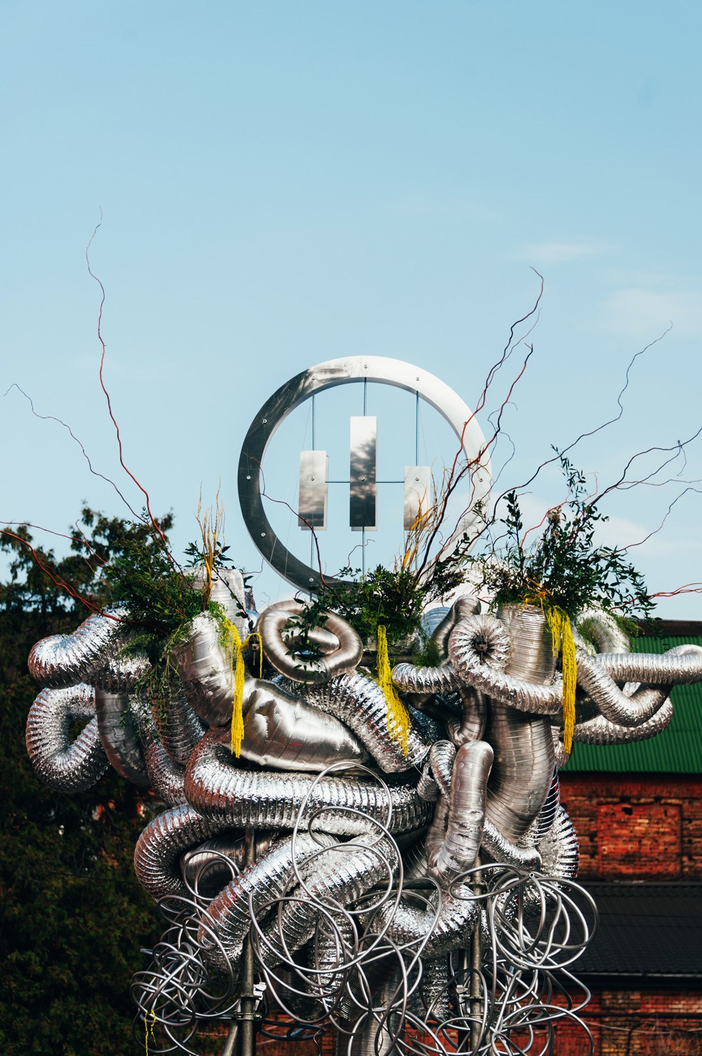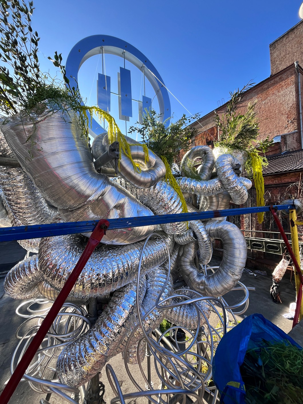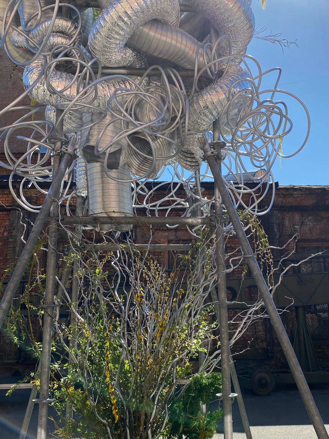 LAYERED STRUCTURE, RECYCLED CORRUGATED, ALUMINUM AND METAL-PLASTIC PIPES OF VARIOUS DIAMETERS, MIRRORED STAINLESS STEEL, CONSTRUCTION STUDS, CONNECTING FIXTURES, FORMING METAL MESH, METAL WIRE, FISHING LINE, CHROME SPRAY PAINT, COMPOSITIONS OF GREENERY AND YELLOW AMARANTH, MOSS, BRANCHES, STONES.