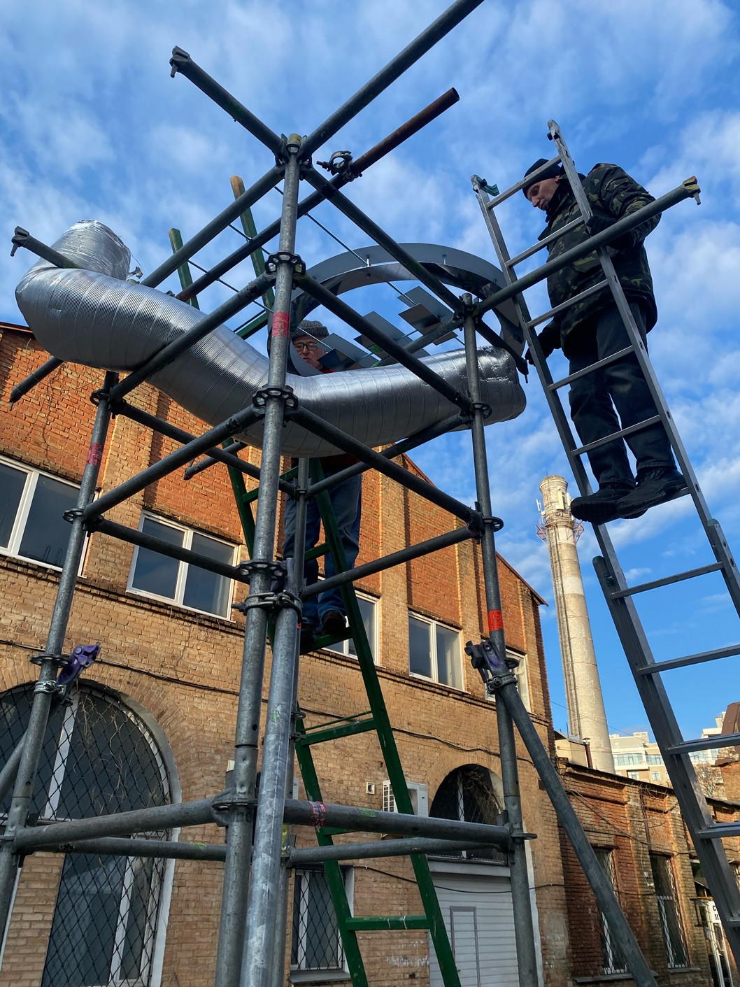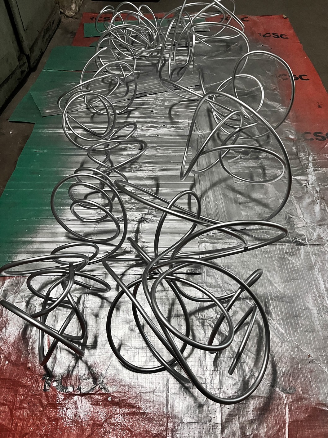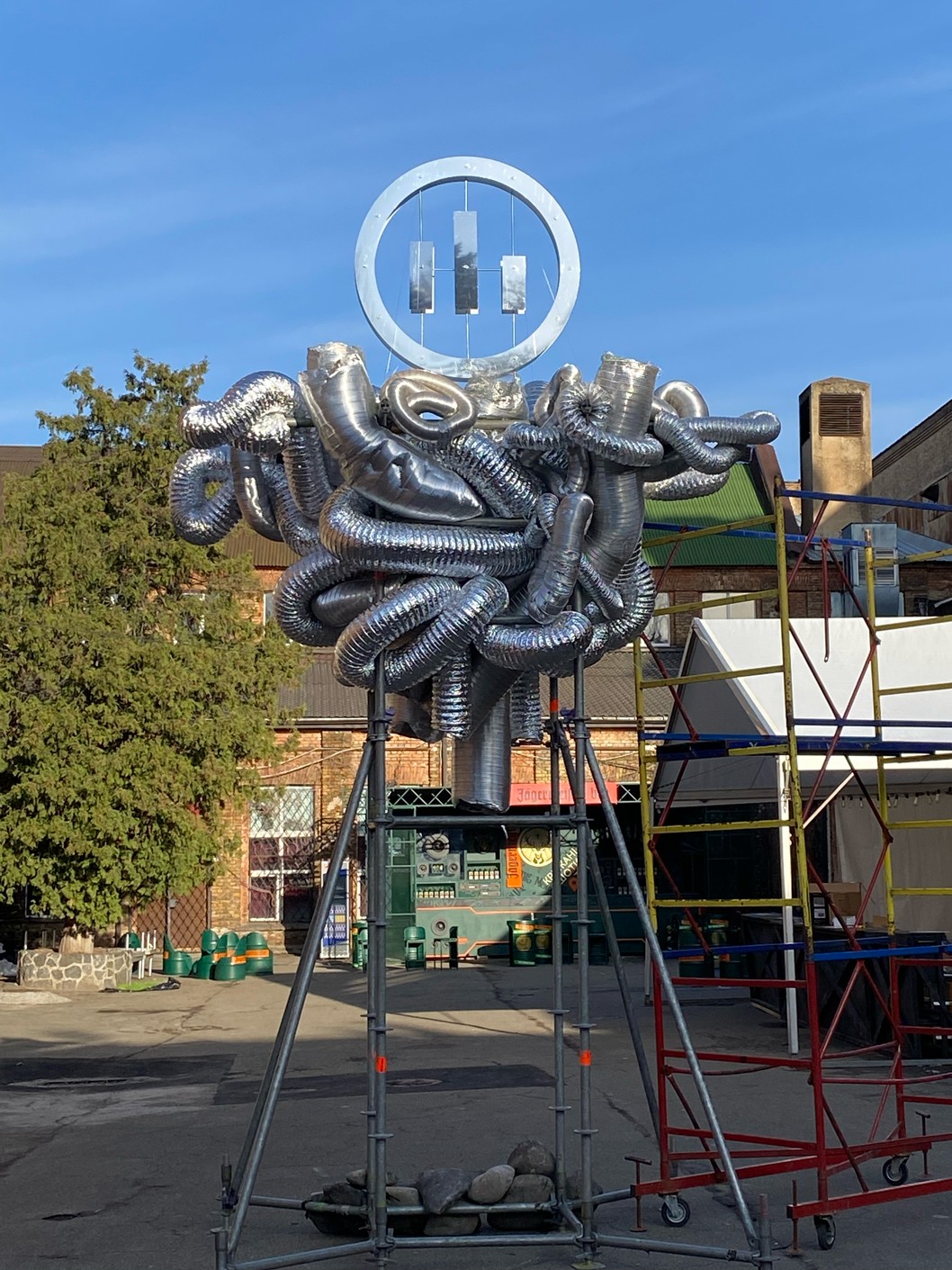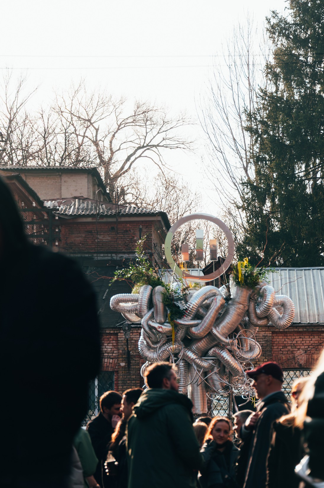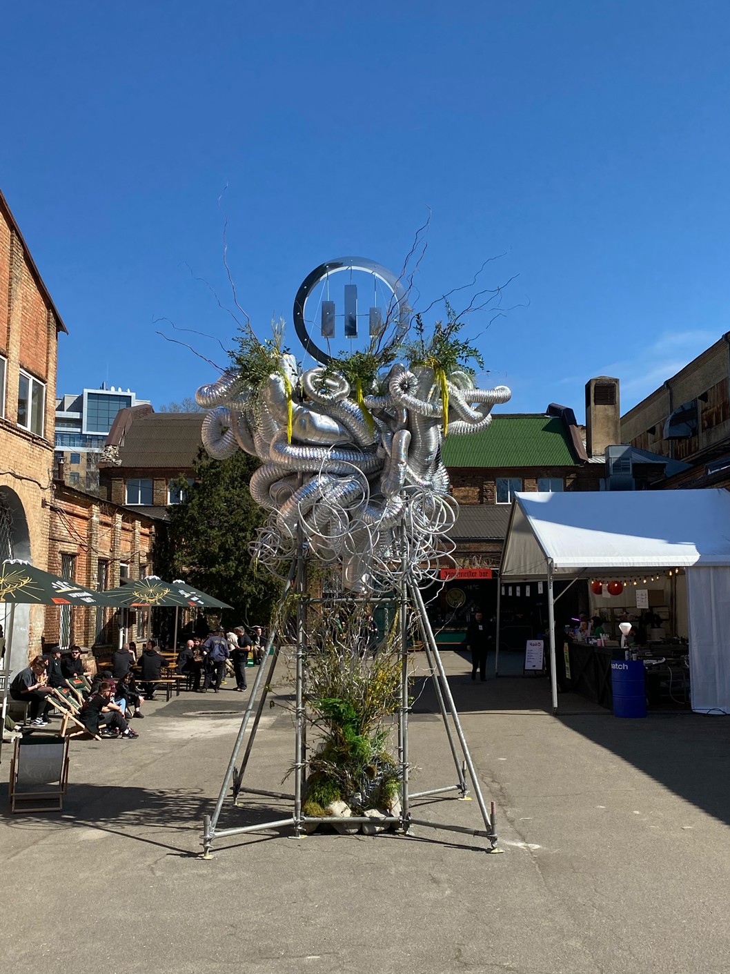 LAYERED STRUCTURE, RECYCLED CORRUGATED, ALUMINUM AND METAL-PLASTIC PIPES OF VARIOUS DIAMETERS, MIRRORED STAINLESS STEEL, CONSTRUCTION STUDS, CONNECTING FIXTURES, FORMING METAL MESH, METAL WIRE, FISHING LINE, CHROME SPRAY PAINT, COMPOSITIONS OF GREENERY AND YELLOW AMARANTH, MOSS, BRANCHES, STONES.