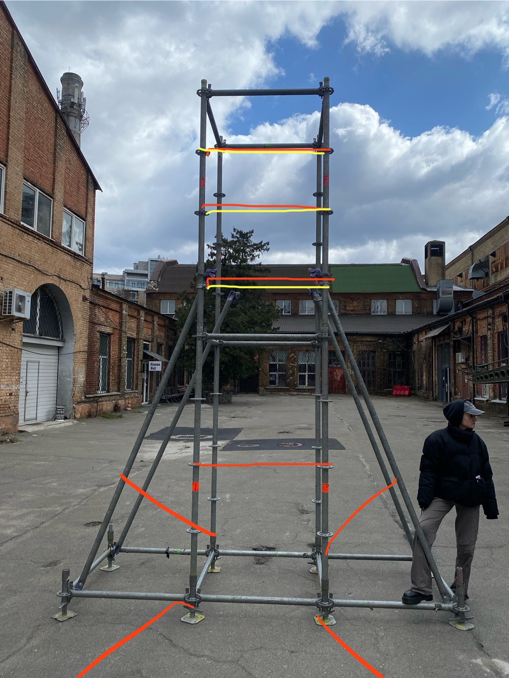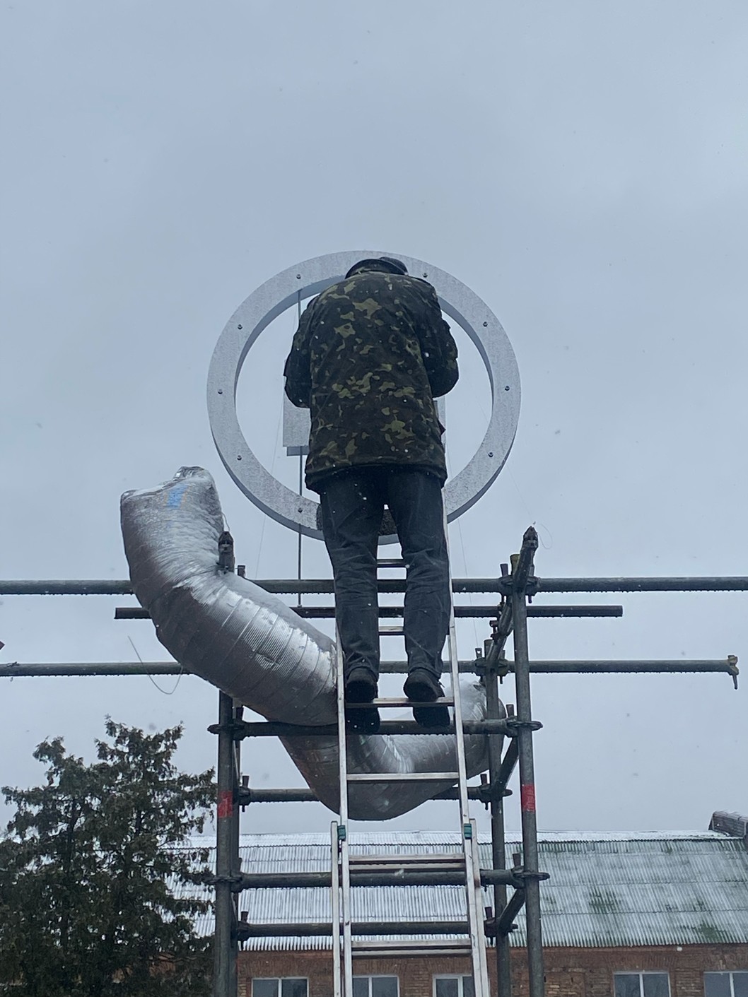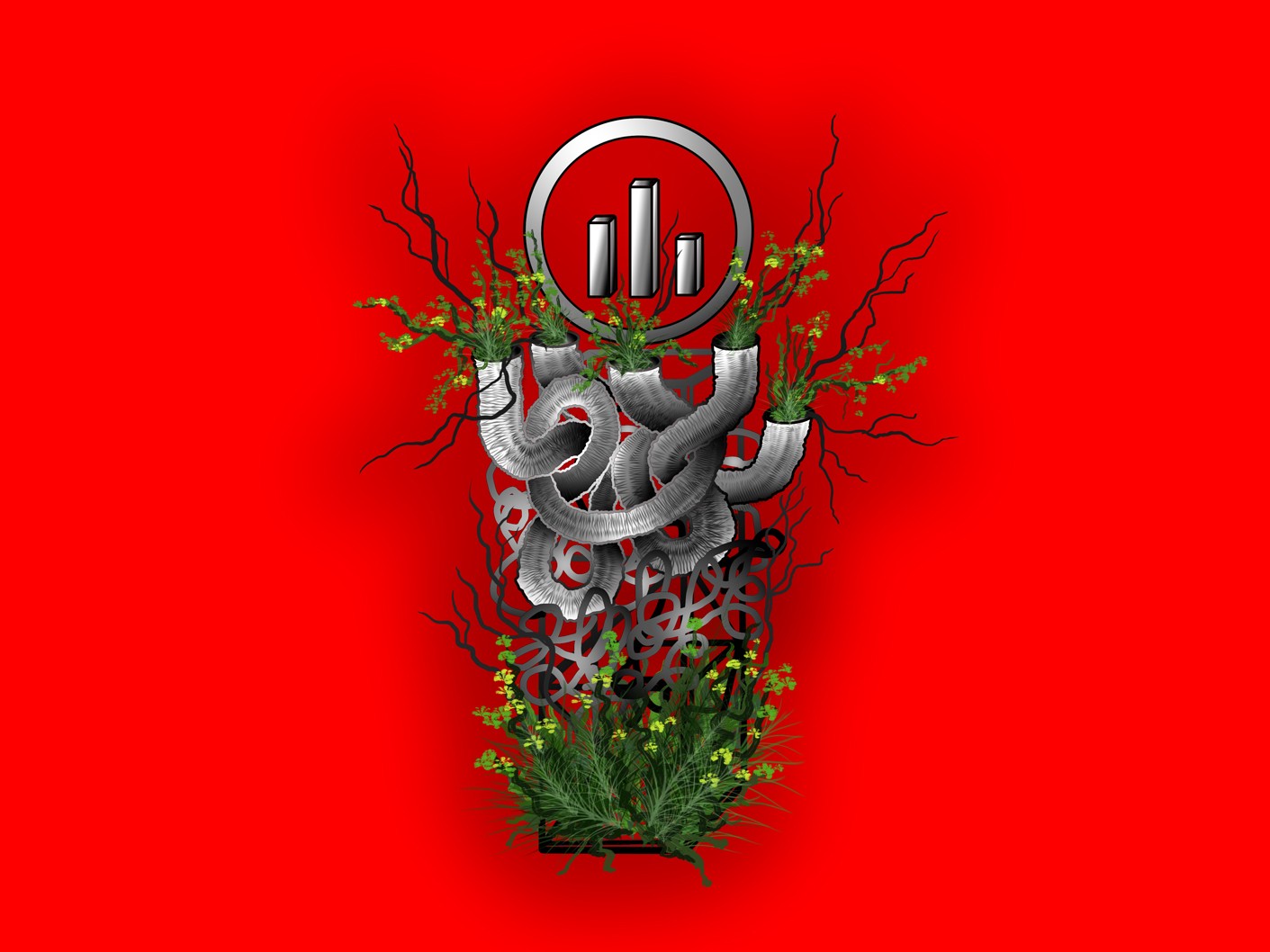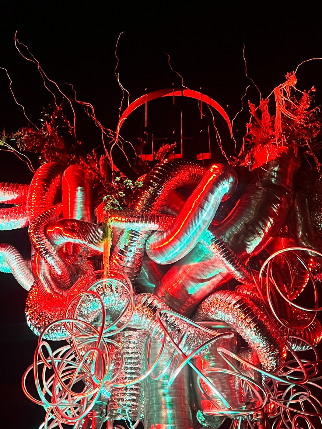 LAYERED STRUCTURE, RECYCLED CORRUGATED, ALUMINUM AND METAL-PLASTIC PIPES OF VARIOUS DIAMETERS, MIRRORED STAINLESS STEEL, CONSTRUCTION STUDS, CONNECTING FIXTURES, FORMING METAL MESH, METAL WIRE, FISHING LINE, CHROME SPRAY PAINT, COMPOSITIONS OF GREENERY AND YELLOW AMARANTH, MOSS, BRANCHES, STONES.