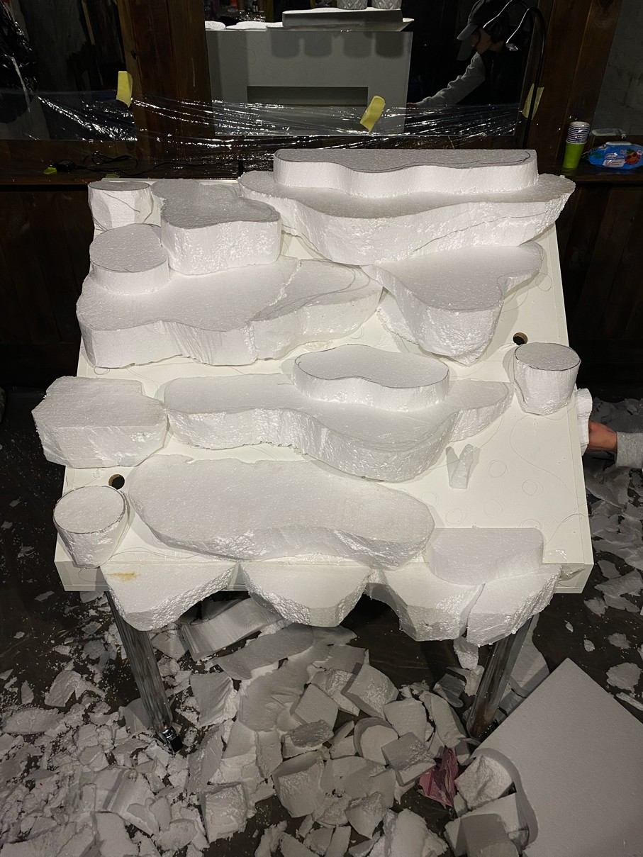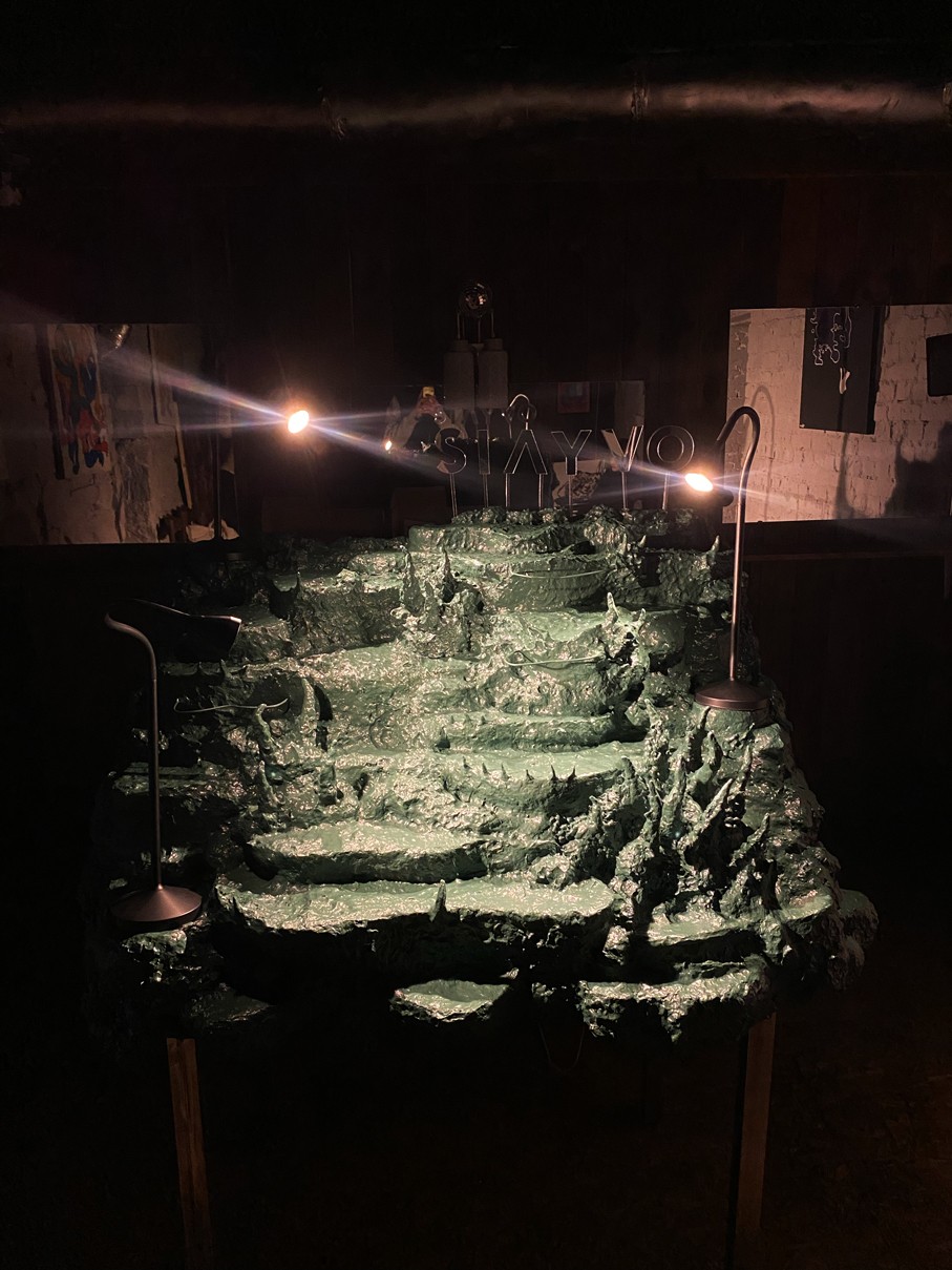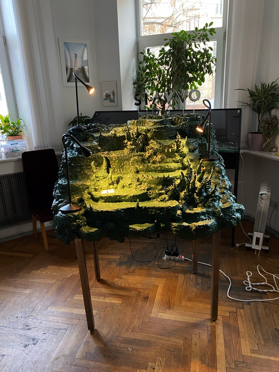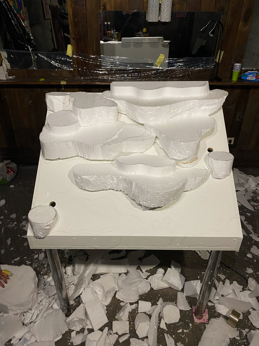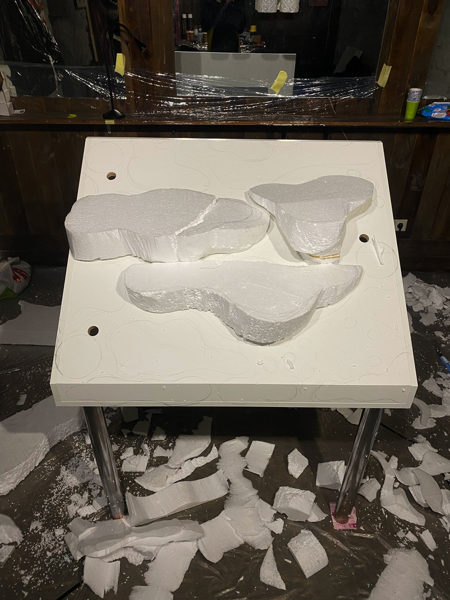 WOODEN TABLE FRAME FROM 22F, PAPIER-MÂCHÉ, FOAM PLASTIC, MOUNTING FOAM, KNITTING WIRE, CONSTRUCTION NEEDLE, PRIMER, PAINT, VARNISH, ACRYLIC LOGO, LAMPS.