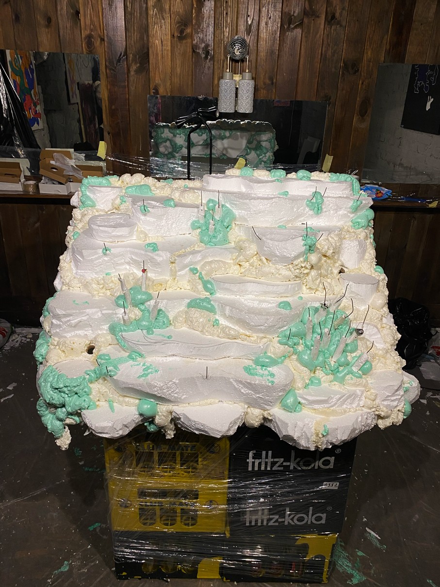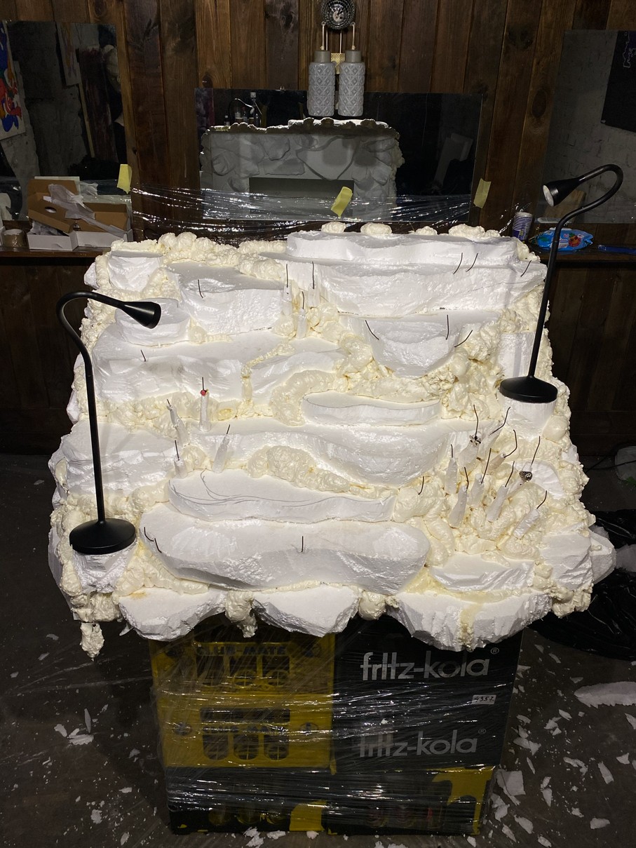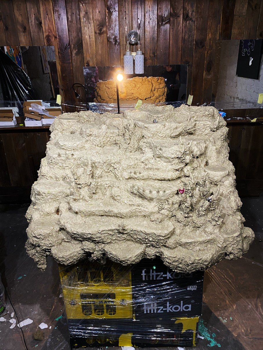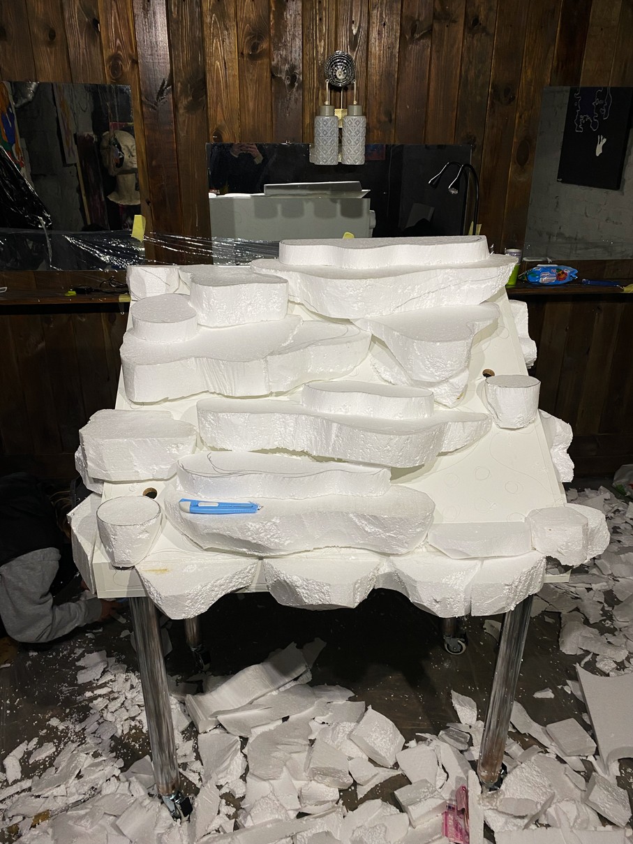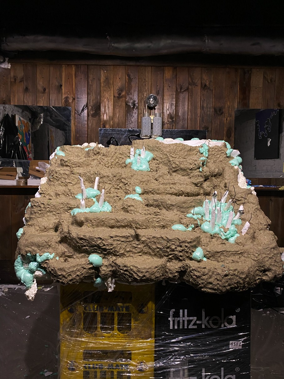 WOODEN TABLE FRAME FROM 22F, PAPIER-MÂCHÉ, FOAM PLASTIC, MOUNTING FOAM, KNITTING WIRE, CONSTRUCTION NEEDLE, PRIMER, PAINT, VARNISH, ACRYLIC LOGO, LAMPS.