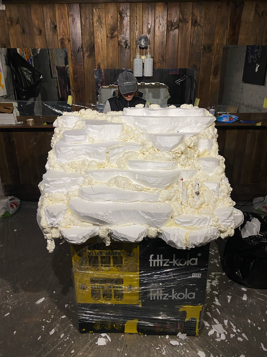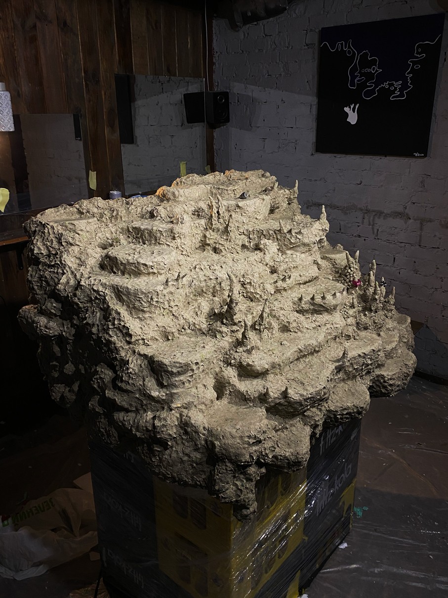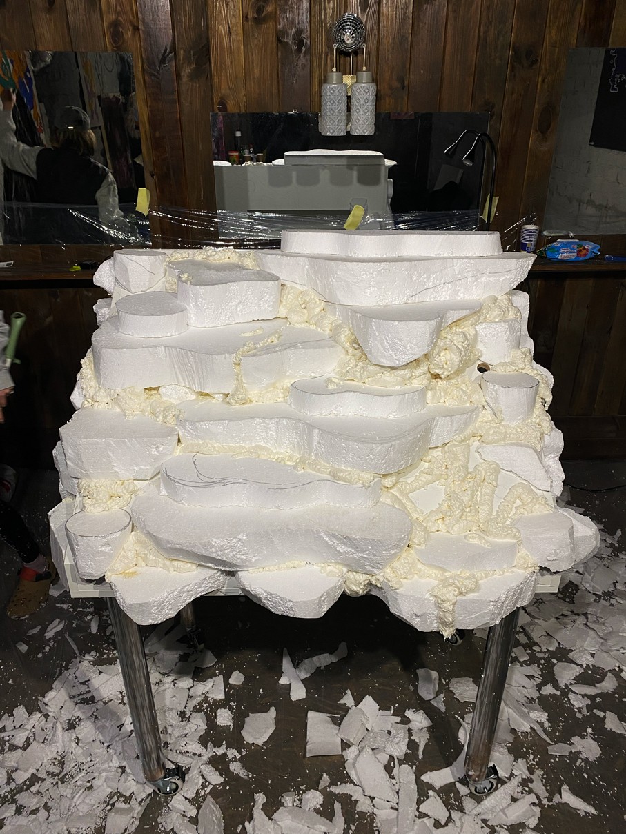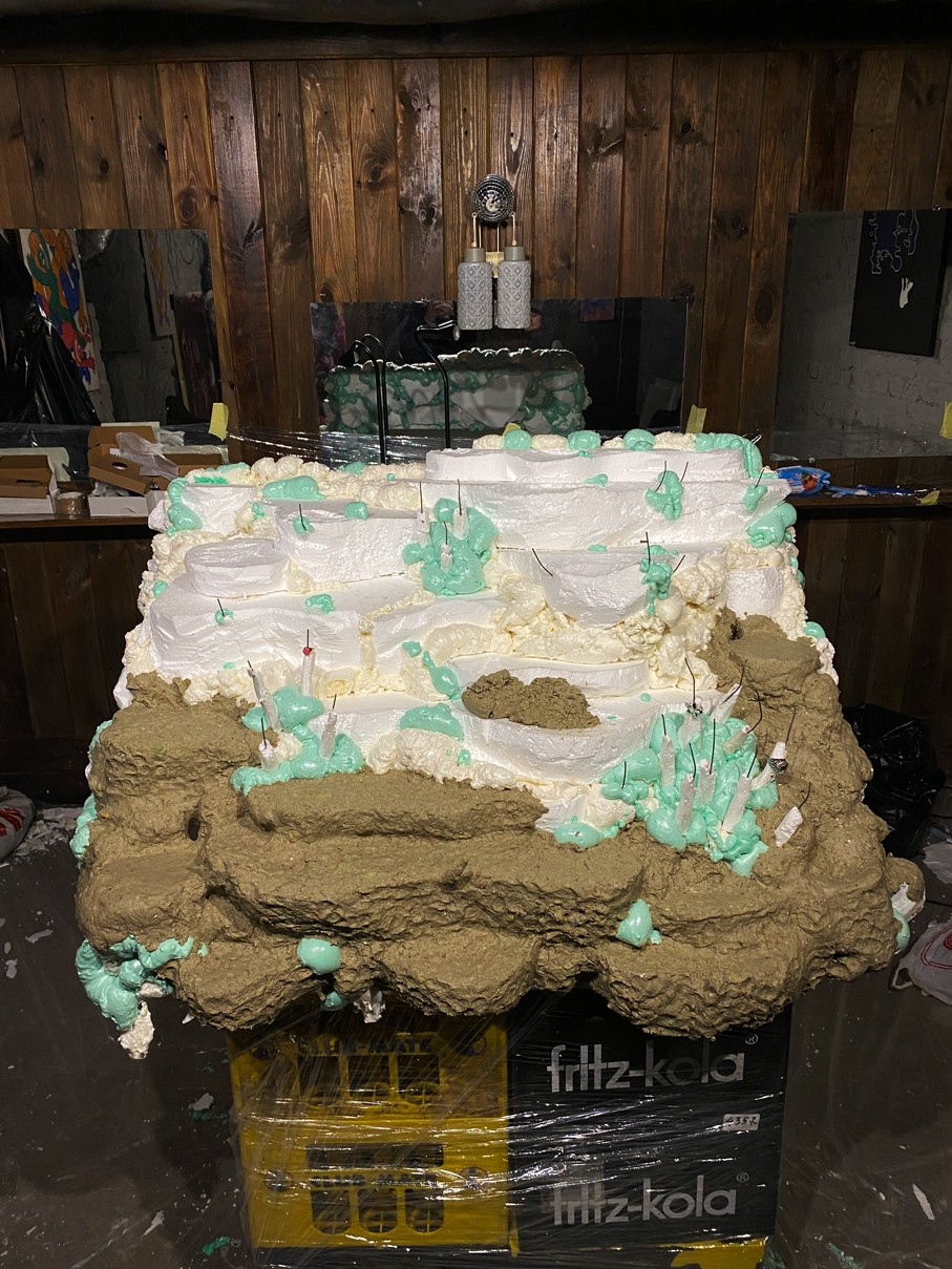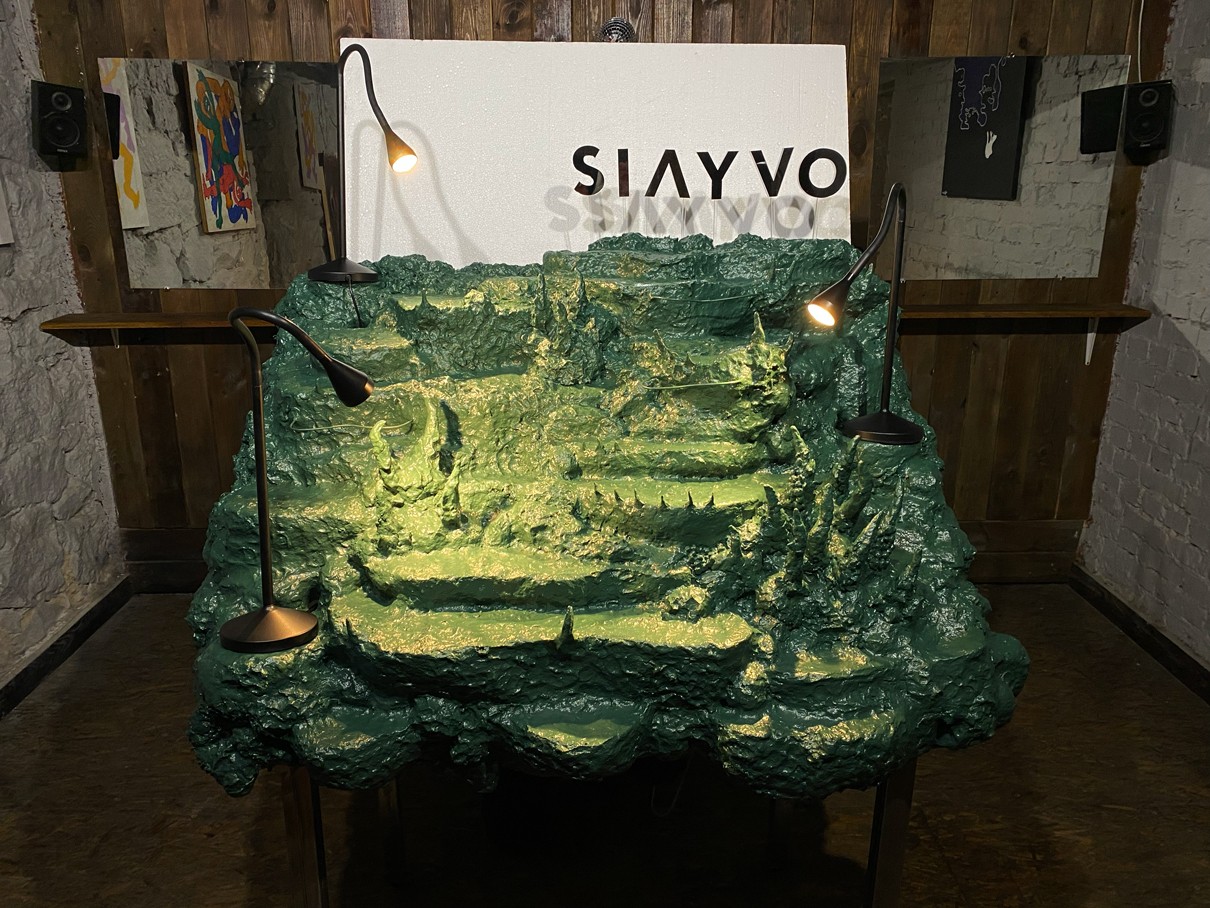 WOODEN TABLE FRAME FROM 22F, PAPIER-MÂCHÉ, FOAM PLASTIC, MOUNTING FOAM, KNITTING WIRE, CONSTRUCTION NEEDLE, PRIMER, PAINT, VARNISH, ACRYLIC LOGO, LAMPS.