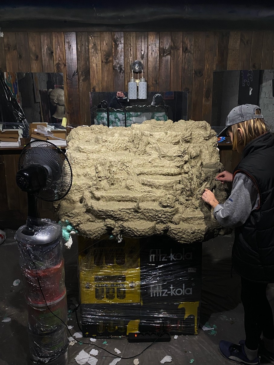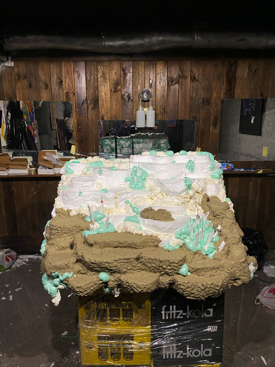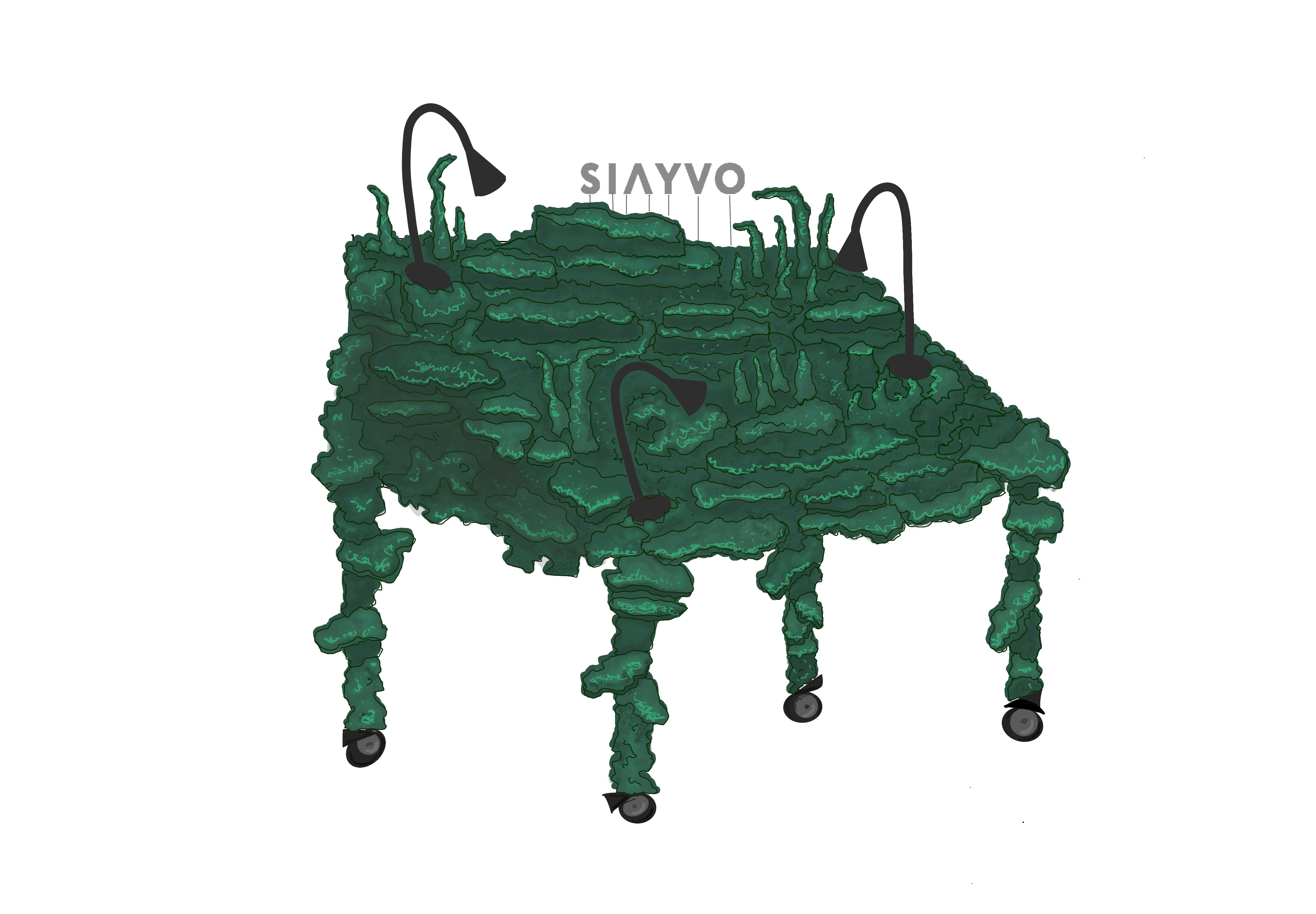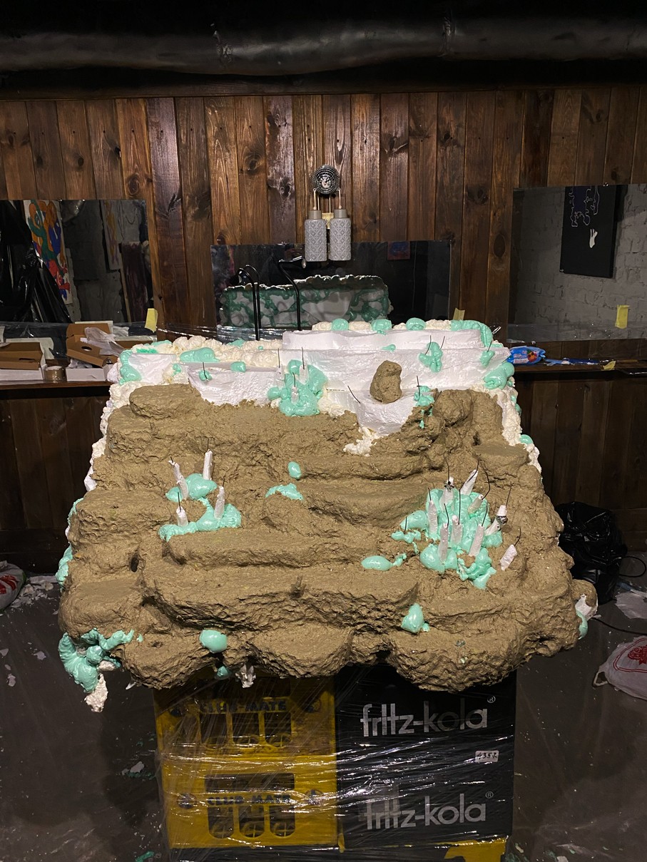 WOODEN TABLE FRAME FROM 22F, PAPIER-MÂCHÉ, FOAM PLASTIC, MOUNTING FOAM, KNITTING WIRE, CONSTRUCTION NEEDLE, PRIMER, PAINT, VARNISH, ACRYLIC LOGO, LAMPS.