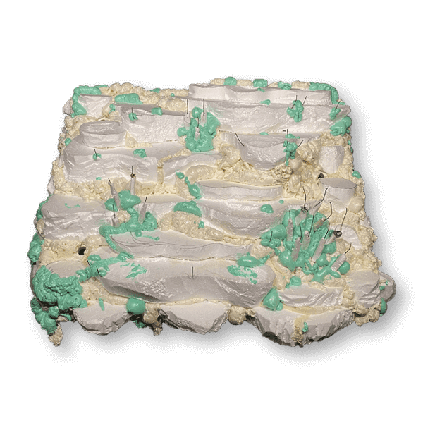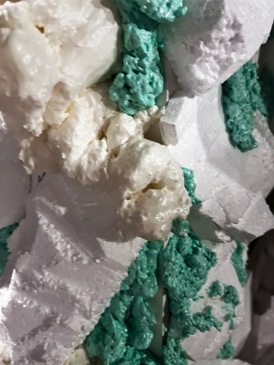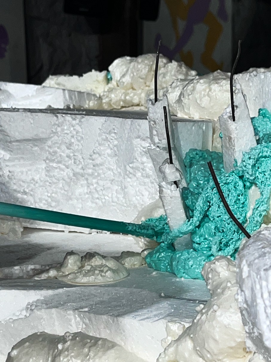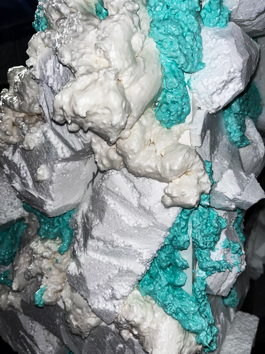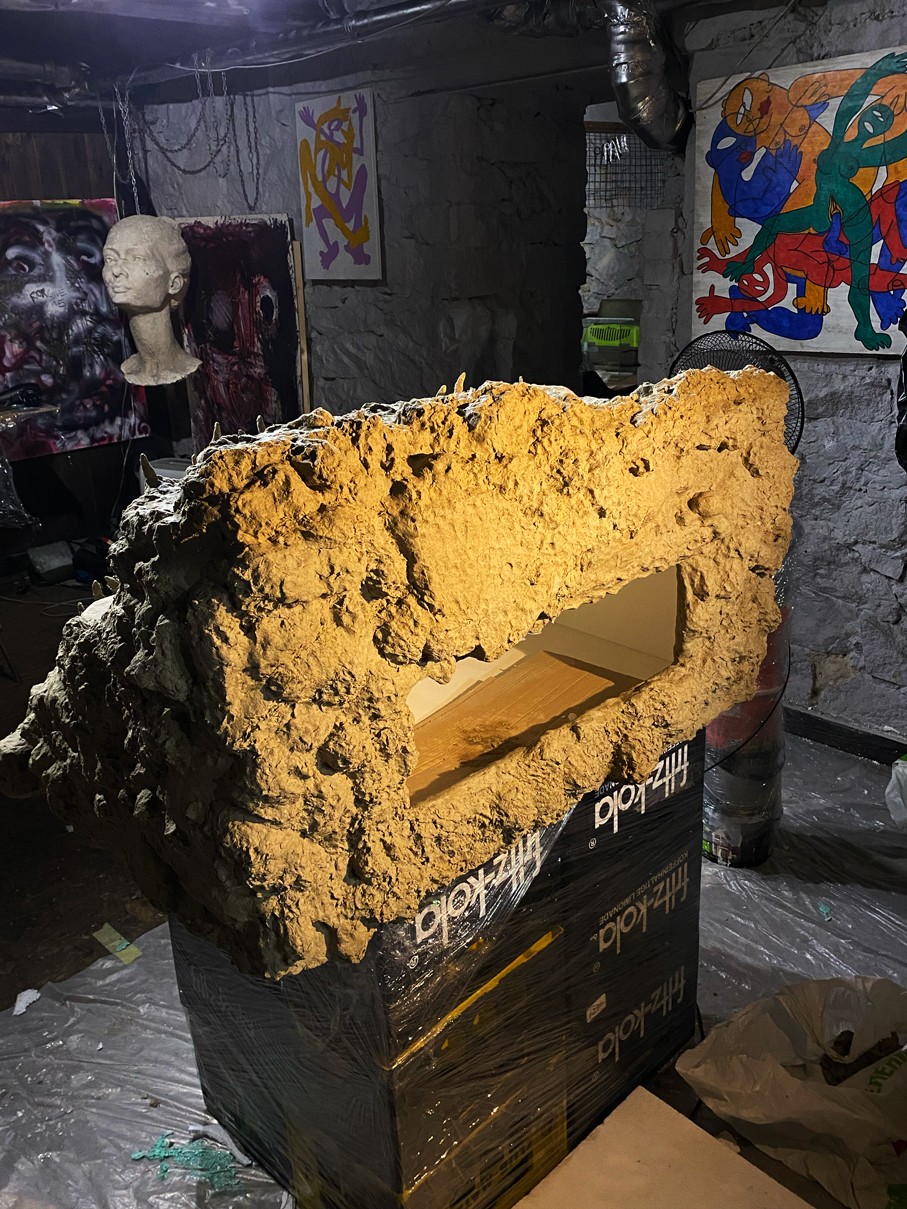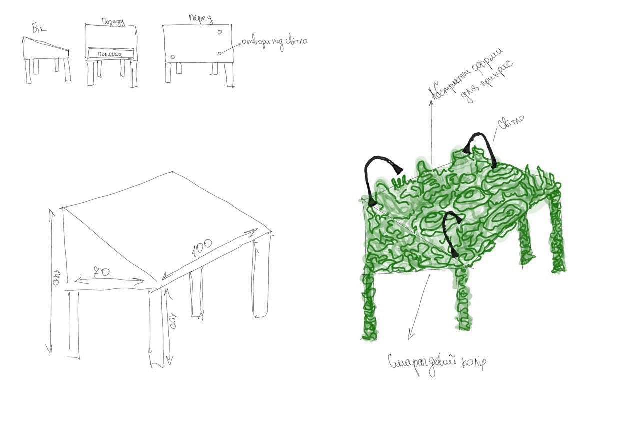 WOODEN TABLE FRAME FROM 22F, PAPIER-MÂCHÉ, FOAM PLASTIC, MOUNTING FOAM, KNITTING WIRE, CONSTRUCTION NEEDLE, PRIMER, PAINT, VARNISH, ACRYLIC LOGO, LAMPS.