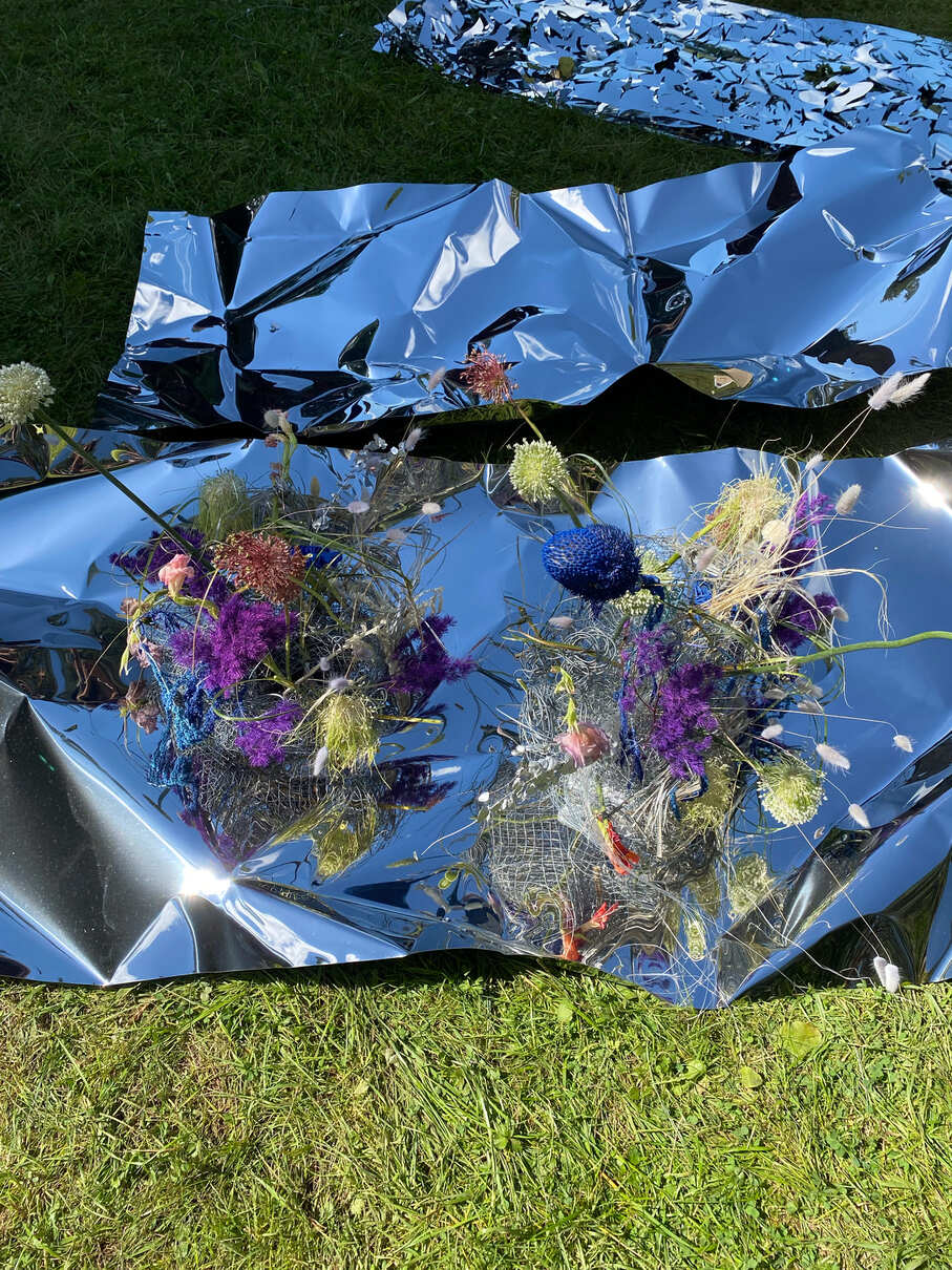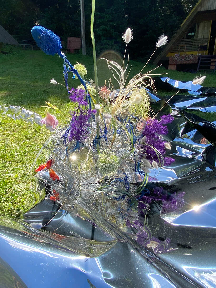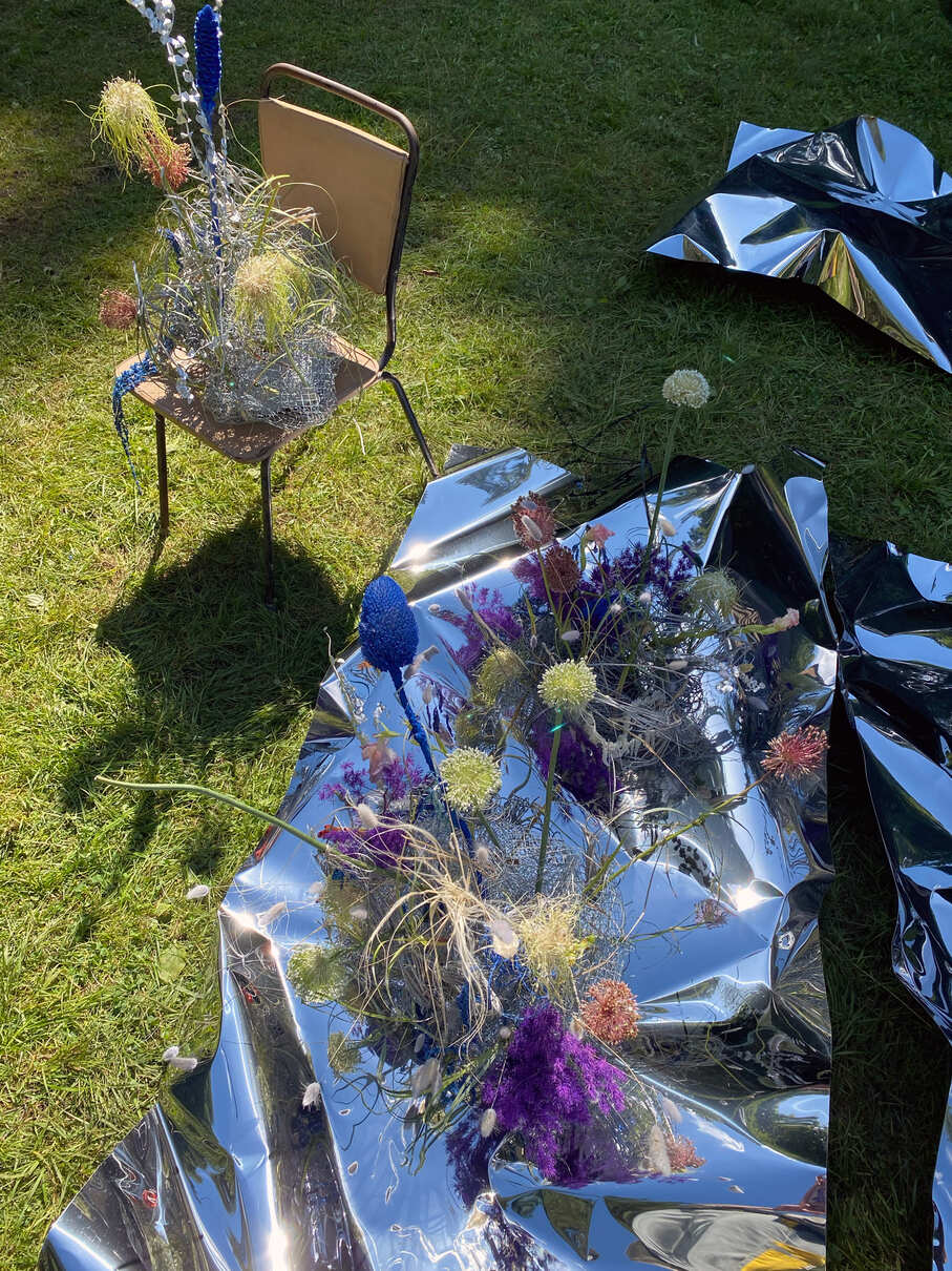 DJ PLACE – METAL PIPES, SILVER FABRIC, STAPLES, TIES, METAL FORMING MESH, STABILIZED DRIED FLOWERS, STABILIZED IVORY AMARANTH, BEADS, METAL WIRE, CHROME PAINT, SPRAY VARNISH, AND STONES.