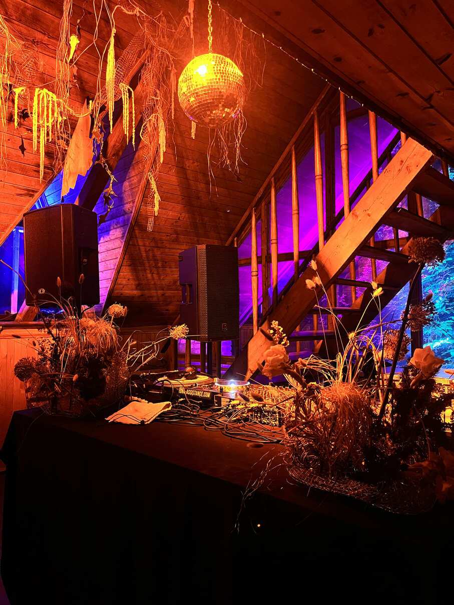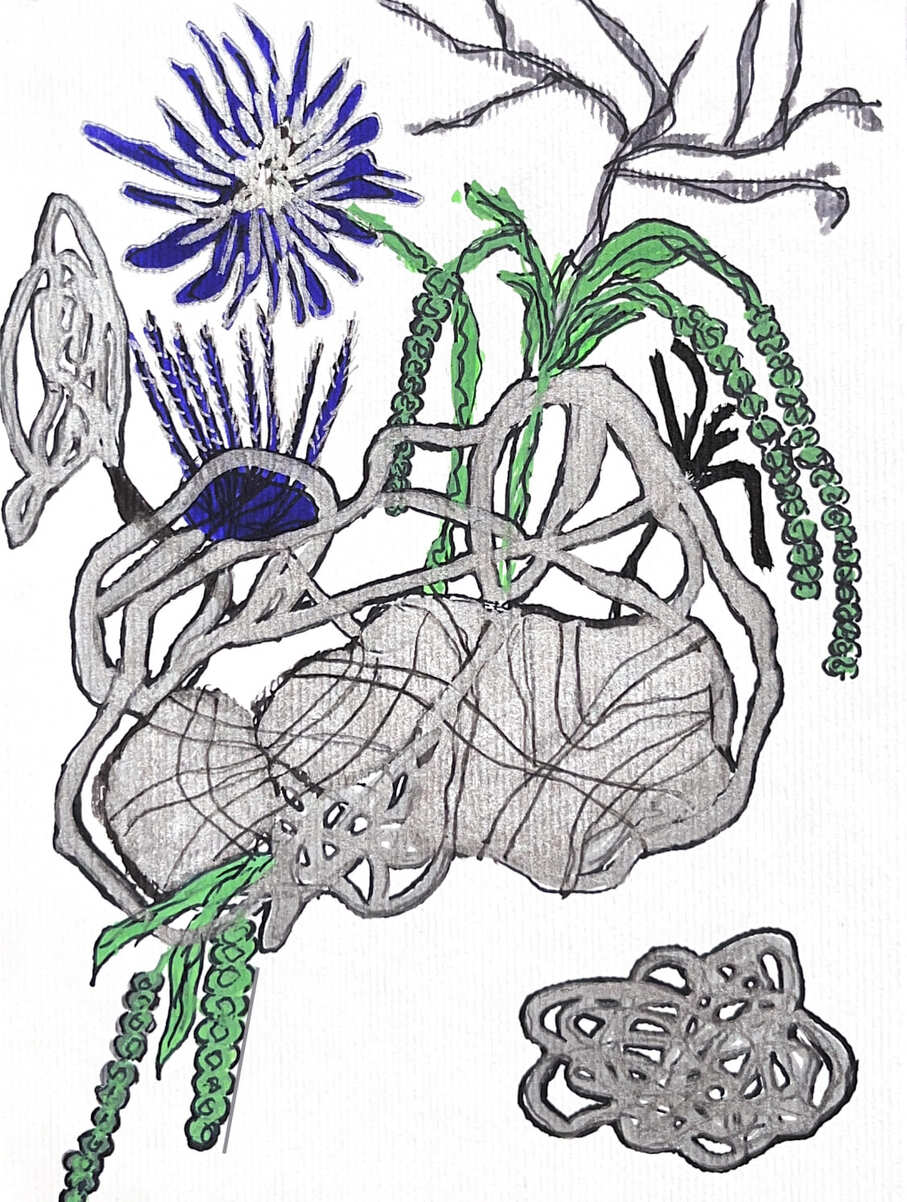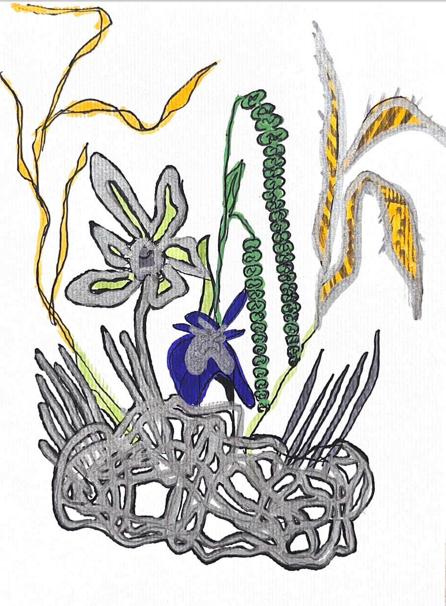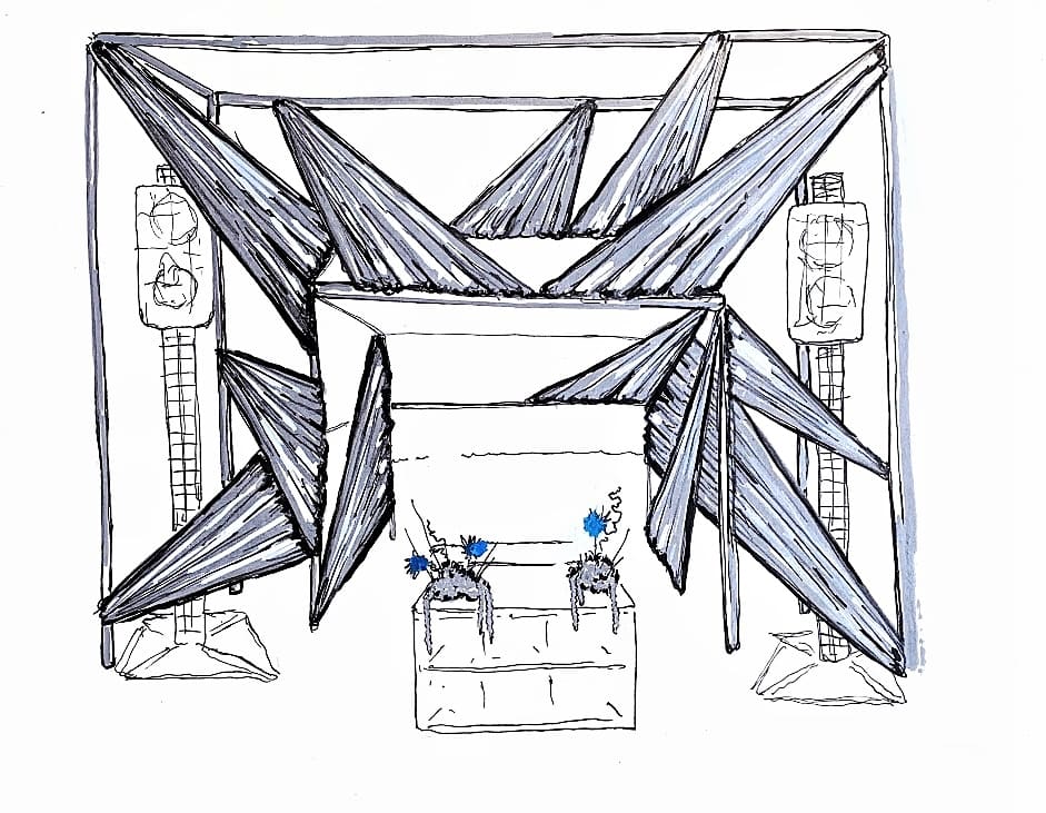 DJ PLACE – METAL PIPES, SILVER FABRIC, STAPLES, TIES, METAL FORMING MESH, STABILIZED DRIED FLOWERS, STABILIZED IVORY AMARANTH, BEADS, METAL WIRE, CHROME PAINT, SPRAY VARNISH, AND STONES.