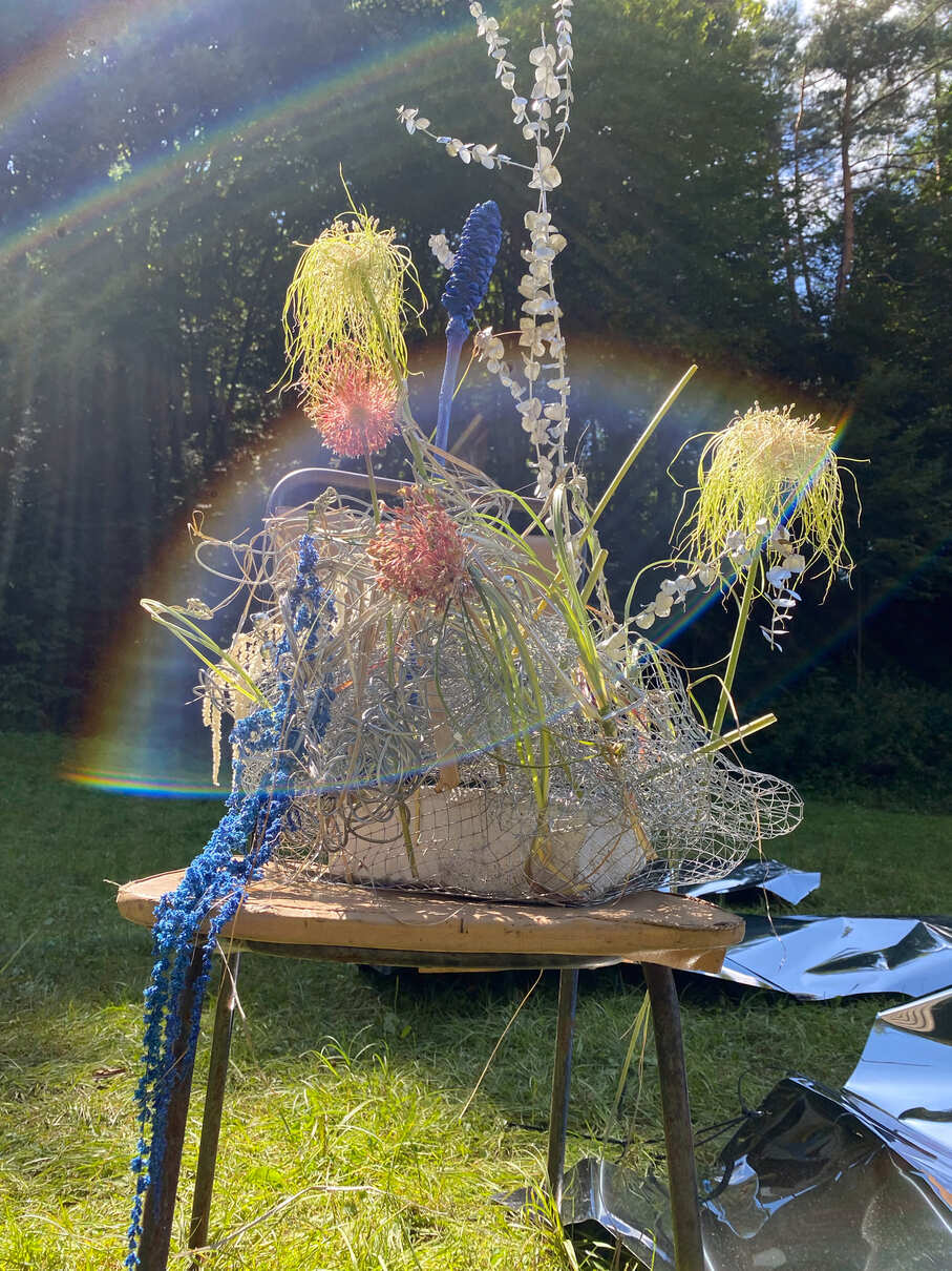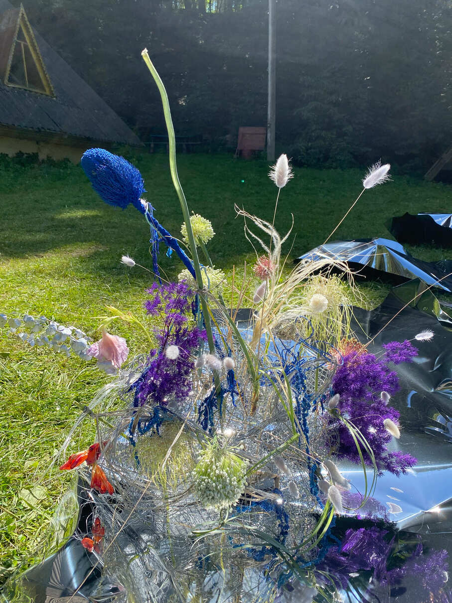AFTERPARTY STAGE “COMPOSITION” METAL MOLDING MESH, STAINLESS STEEL, CATTAIL SHEAF, STABILIZED IVORY AMARANTH, METAL WIRE, STABILIZED DRIED FLOWERS.